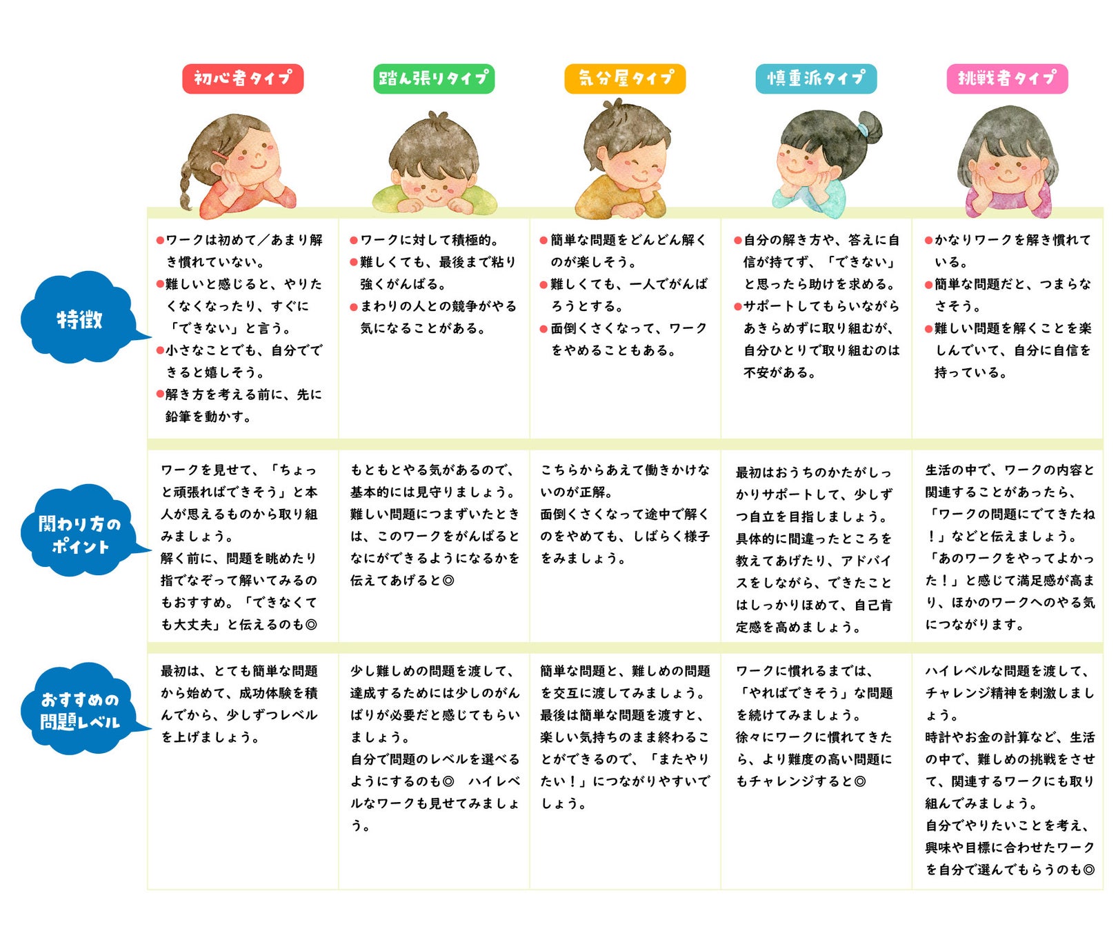 そこで、今回の調査結果をもとに、よく見られる子どものタイプを5つピックアップ。タイプ別に、やる気を引き出すための保護者の関わり方のポイントや、おすすめの難易度を平岡先生と一緒にまとめました。