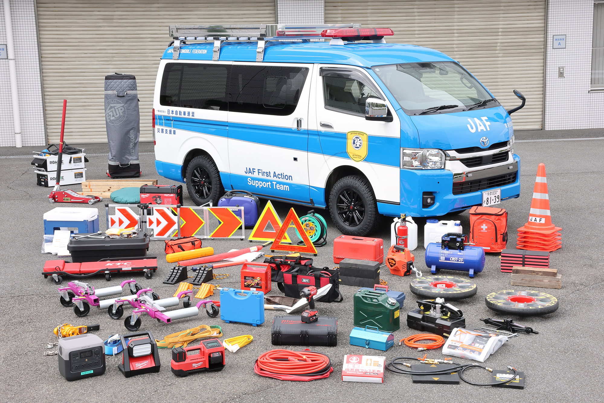 JAF-FAST専用の災害支援車(JAF初導入)は、通常のサービスカーにはない、災害対応資機材を搭載。主な装備は以下のとおりです。