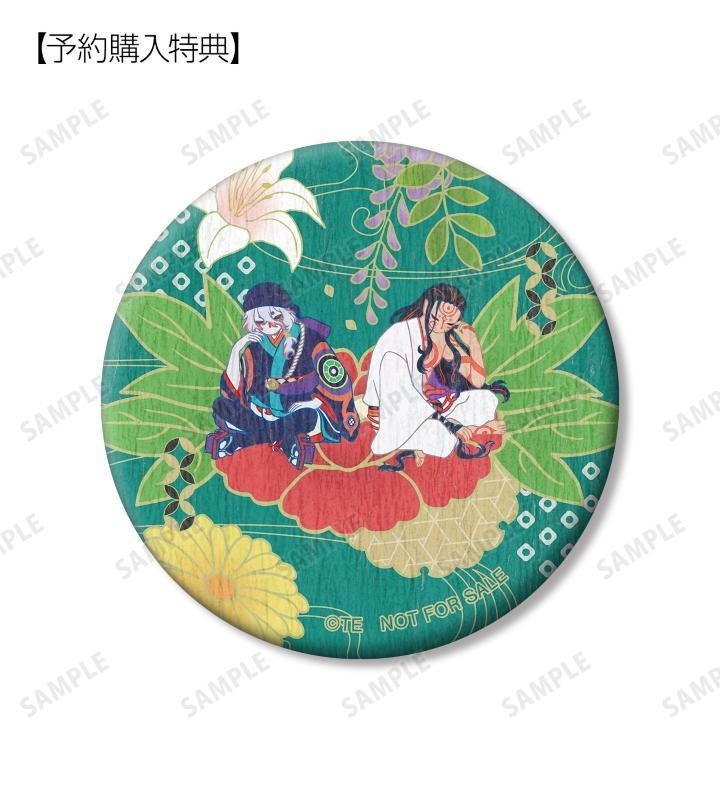 薬売り、神儀のイラストをボタニカルデザインに落とし込んで繊細なタッチで新たに描き起こし、和紙風の缶バッジに仕上げました。