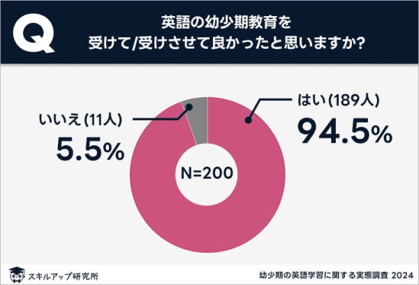 「英語の幼少期教育を受けて/受けさせて良かったと思いますか」という質問に対し、94.5%が「はい」と回答した。一方、「いいえ」と答えたのはわずか5.5%にとどまった。