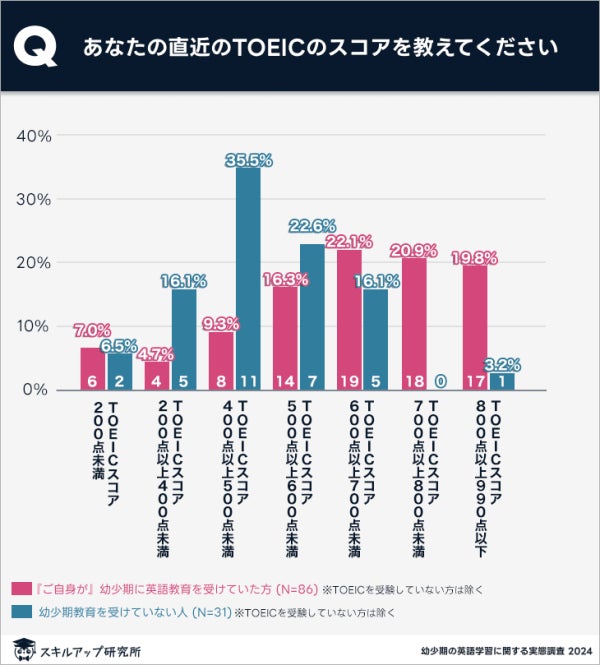 幼少期に英語教育を受けていた方・受けていない方を対象に直近のTOEICスコアを尋ねたところ、