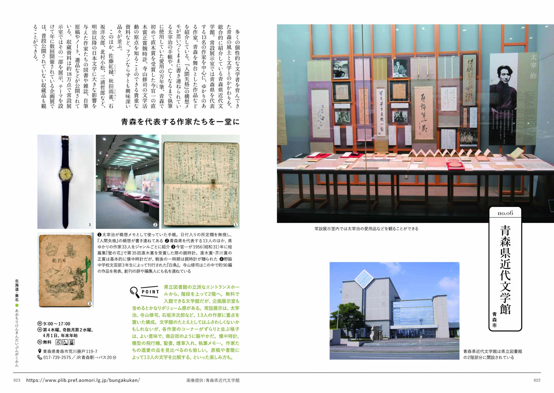 〈北海道・東北エリア〉北海道立文学館/市立小樽文学館/井上靖記念館/三浦綾子記念文学館/有島記念館/青森県近代文学館/太宰治記念館「斜陽館」/三沢市寺山修司記念館/石川啄木記念館/宮沢賢治記念館/日本現代詩歌文学館/仙台文学館/斎藤茂吉記念館/こおりやま文学の森資料館/いわき市立草野心平記念文学館