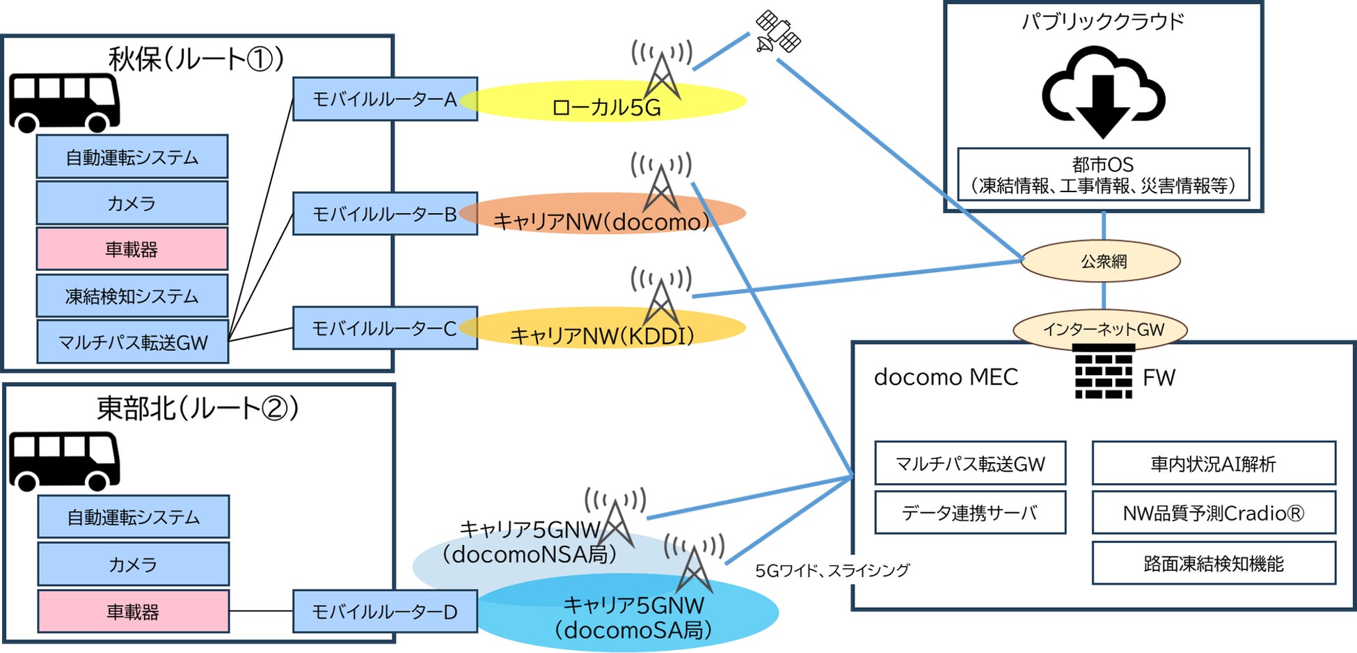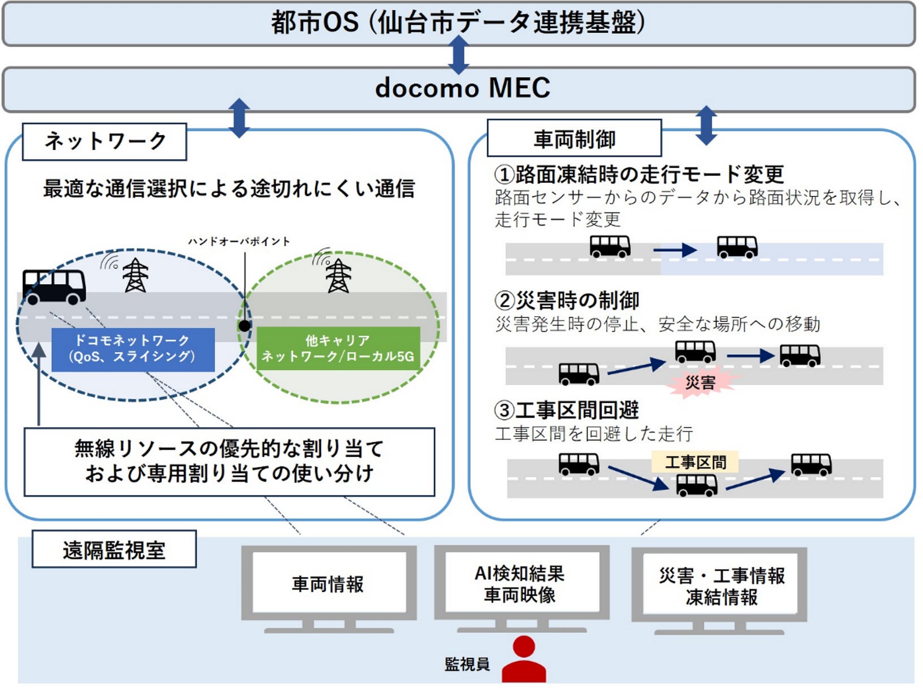 これら二つの地域において、複数キャリア回線やローカル5G(※3)を活用した通信の安定性確保に、2025年10月8日にNTTドコモビジネスより発表した「通信安定化ソリューション」(※4)を活用した初の実証として取り組みます。加えて都市OSとの連携により道路凍結や災害情報、道路工事情報といった環境データを車両制御に反映する仕組みを検証することで、津波発生時の避難や冬季の凍結路面、山間部での通信不安定といった厳しい環境下においても、安全で持続可能な自動運転サービスの実現を目指します。