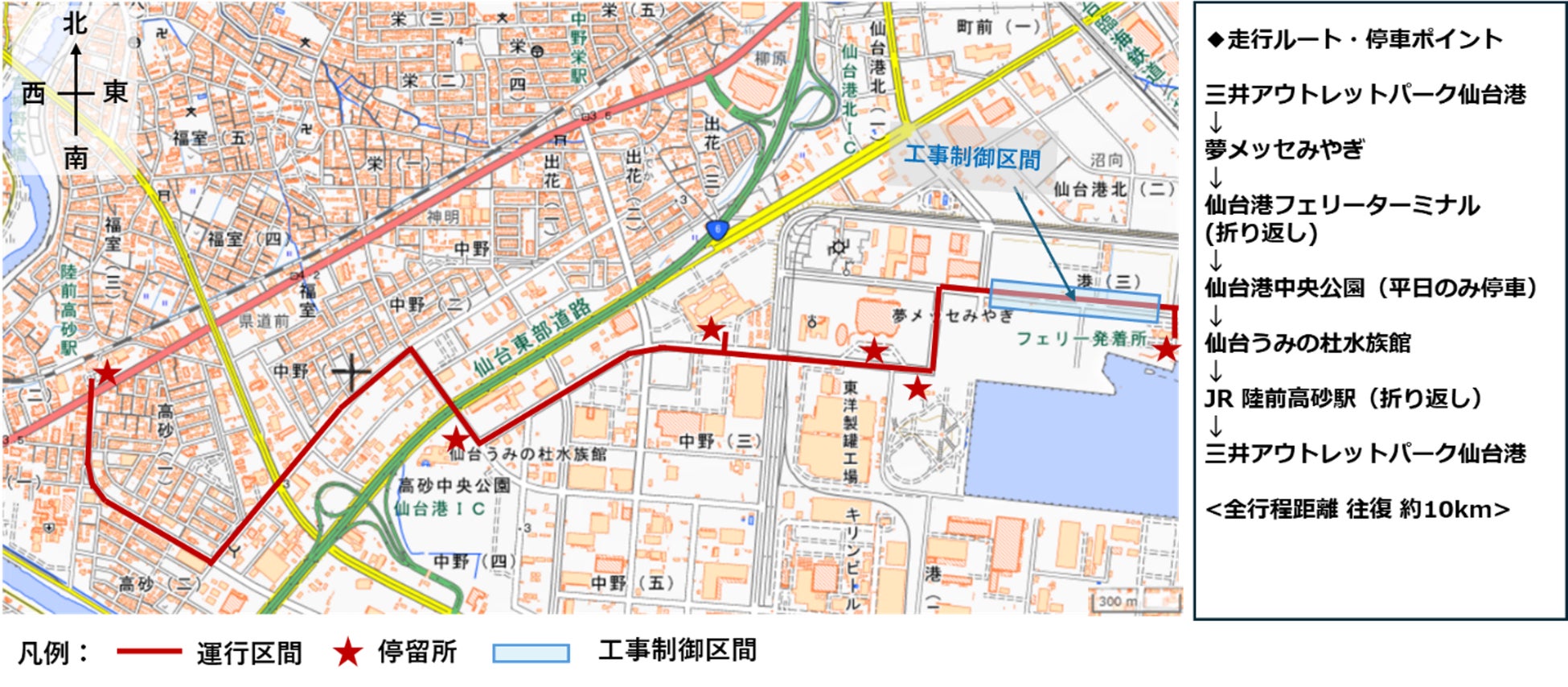 三井アウトレットパーク仙台港→夢メッセみやぎ→仙台港フェリーターミナル→仙台港中央公園→仙台うみの杜水族館→JR陸前高砂駅ロータリー→三井アウトレットパーク仙台港