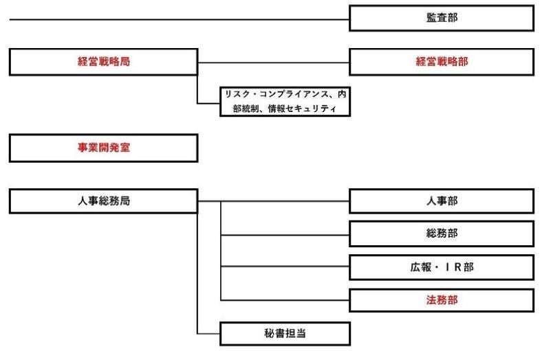 (5)部門のミッションを表現し、わかりやすい部門名にするべく、総合計画局、総合計画部をそれぞれ「経営戦略局」「経営戦略部」に、ビジネス法務部を「法務部」に、コンテンツ運用部を「コンテンツマネジメント部」に名称変更する。