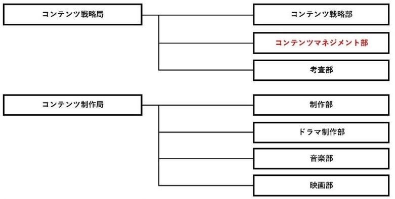 (4)コンテンツ事業部と広告イベント事業部の機能を統合して「事業部」とし、コンテンツ企画部、制作推進部をコンテンツ戦略部に統合、コンテンツ戦略局映画部をコンテンツ制作局に移管し管轄するなど、部門統合・再編成による意思決定のスピードアップおよび現場の中核人材の増強を図る。