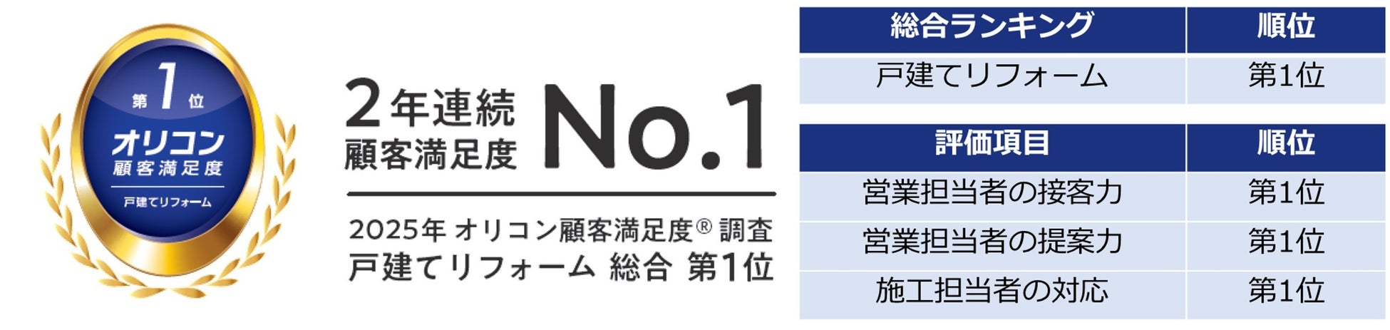 パナソニック ハウジングソリューションズ株式会社(代表取締役 社長執行役員:山田 昌司 本社:大阪府門真市、以下、当社)が運営する、パナソニックの理念に共感するリフォーム専門ショップのネットワークであるPanasonic リフォームClubは、株式会社oricon MEが実施した「2025年 オリコン顧客満足度(R)調査」において、戸建てリフォームランキングで総合第1位を獲得しました。加えて、「営業担当者の接客力」「営業担当者の提案力」「施工担当者の対応」の評価項目においても、第1位の評価を獲得しました。同調査において、2年連続で総合第1位を獲得するのは、当社として初めてとなります。この受賞を契機に、Panasonic リフォームClubは今後も「提案力」「施工力」「顧客対応力」のさらなる向上を目指し、地域の皆さまに信頼されるリフォームパートナーとして、より良い暮らしの実現に貢献していきます。