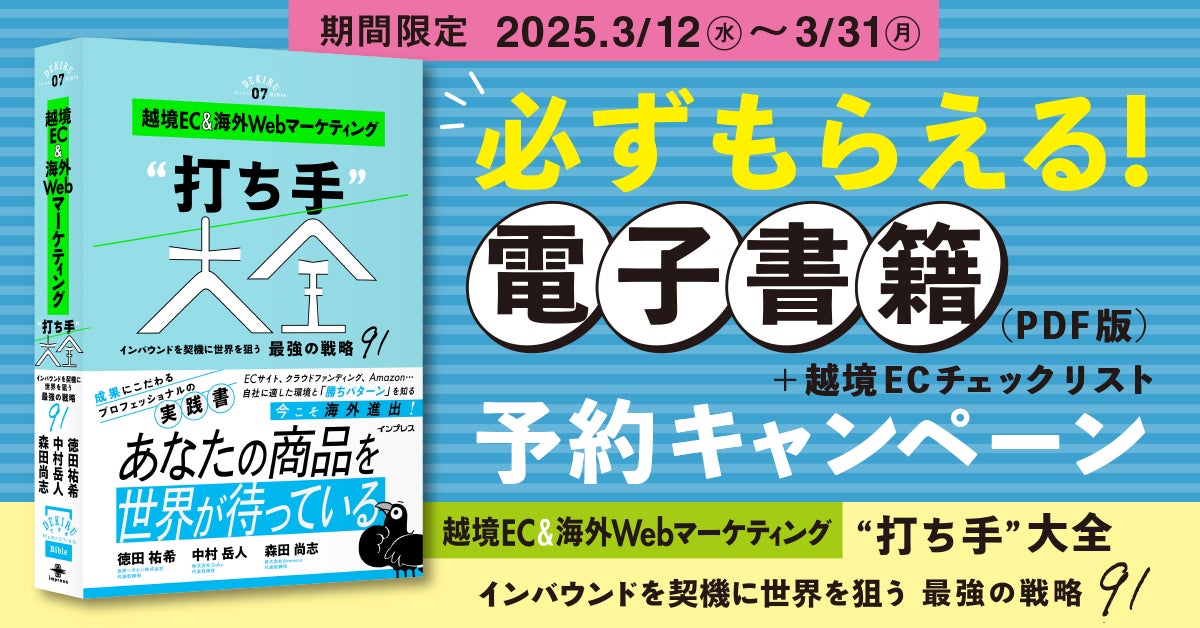 インプレスグループでIT関連メディア事業を展開する株式会社インプレス(本社:東京都千代田区、代表取締役社長:高橋隆志)は、書籍『越境EC&海外Webマーケティング“打ち手”大全 インバウンドを契機に世界を狙う 最強の戦略 91(できるMarketing Bible)』を2025年4月1日(火)に発売いたします。これに先駆けて、3月31日(月)までにオンライン書店にて本書を予約し、特設ページからお申し込みいただいた方を対象に、本書の電子書籍(PDF版)と「越境ECチェックリスト」をプレゼントする予約キャンペーンを実施いたします。