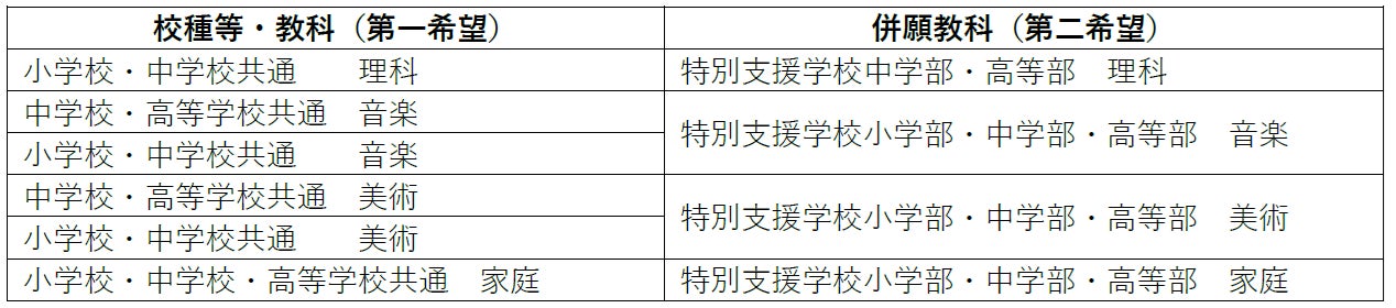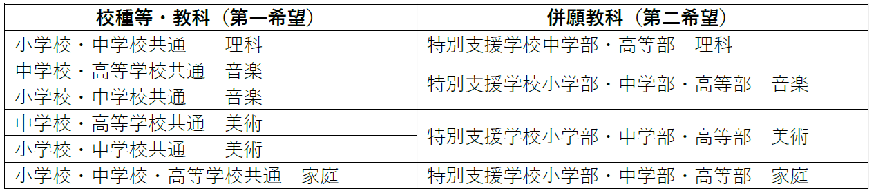 併願可能な校種等・教科の組み合わせに以下を追加します。