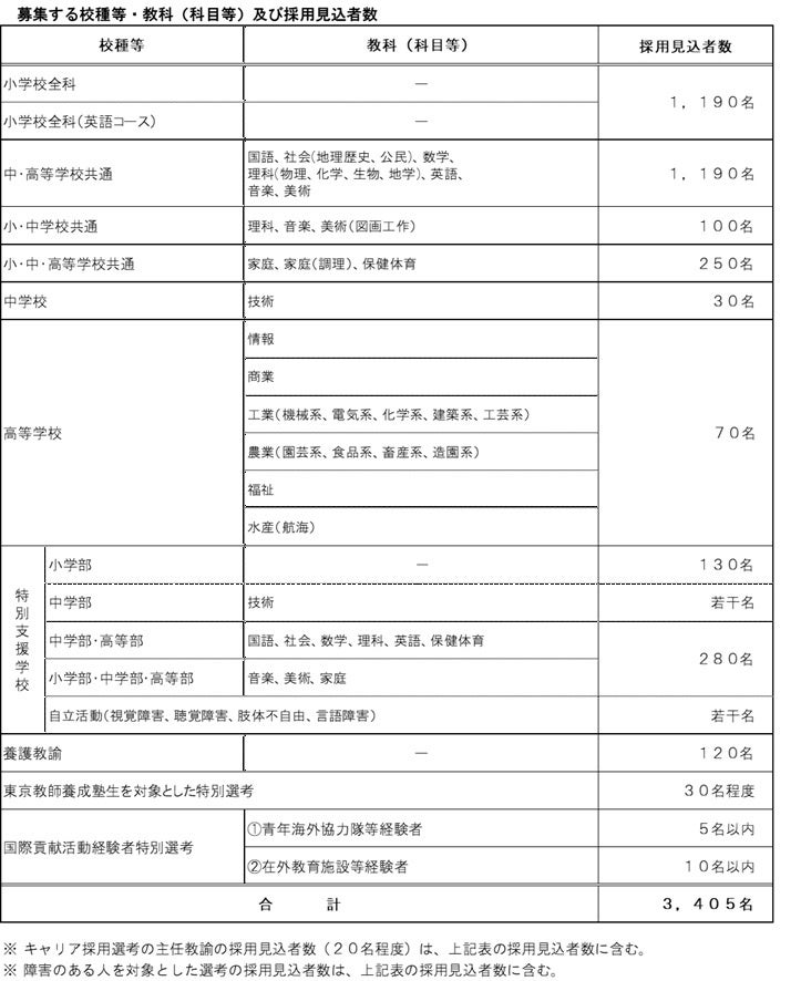 募集する校種等・教科(科目等)及び採用見込者数の詳細は、裏面のとおりです。