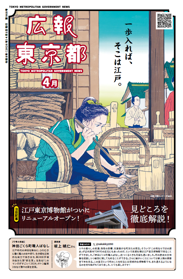 東京都では、都政や都民生活に必要な情報を伝えるため、広報紙「広報東京都」を毎月1日に発行しています。4月号は、4年間の改修を経て、令和8年3月31日にリニューアルオープンする江戸東京博物館の見どころを多くの写真とともにご紹介します。まさに「一歩入れば、そこは江戸」!今号は、『神田ごくら町職人ばなし』の表紙が目印です。ぜひ、お手に取ってお読みください。