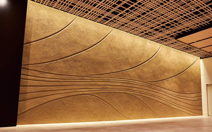 ・入口を進むと東京マイスター・久住有生氏による左官仕上げを施した壁がお出迎え。美しい仕上がりは圧巻