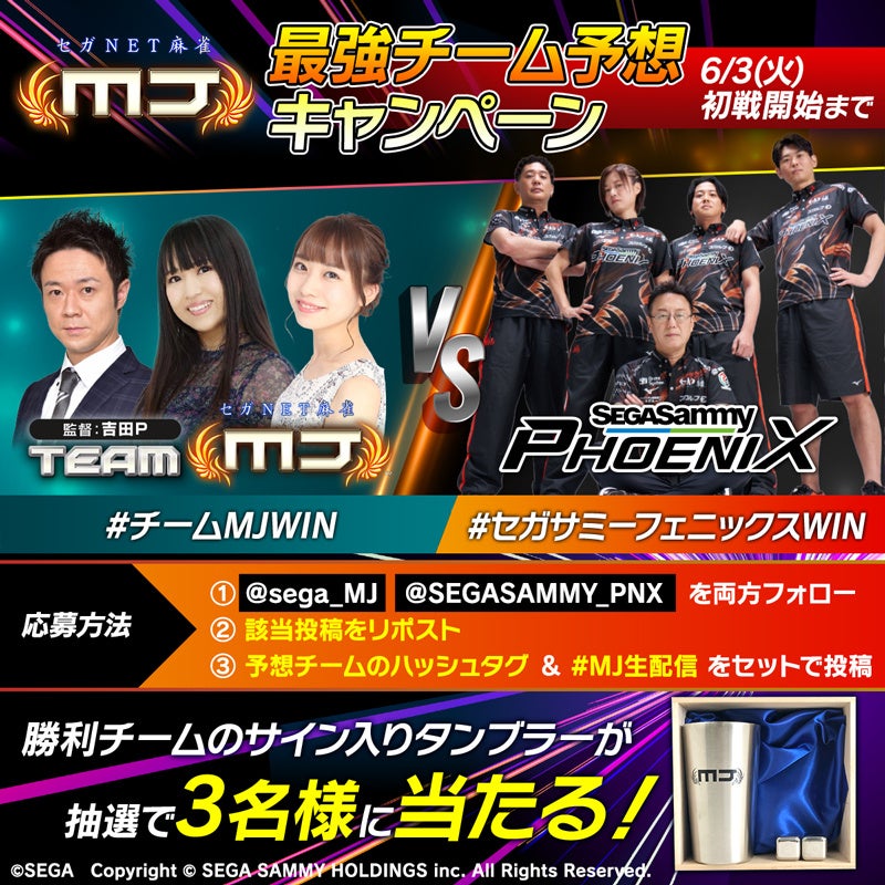 6月3日(火)19:30より配信予定の“【セガNET麻雀 MJ】最強チーム決定戦‼ TEAM MJ VS セガサミーフェニックス”において、「セガサミーフェニックス」とTEAM MJのどちらが勝つかを予想するキャンペーンを『MJ』公式X(@sega_MJ)で実施します。