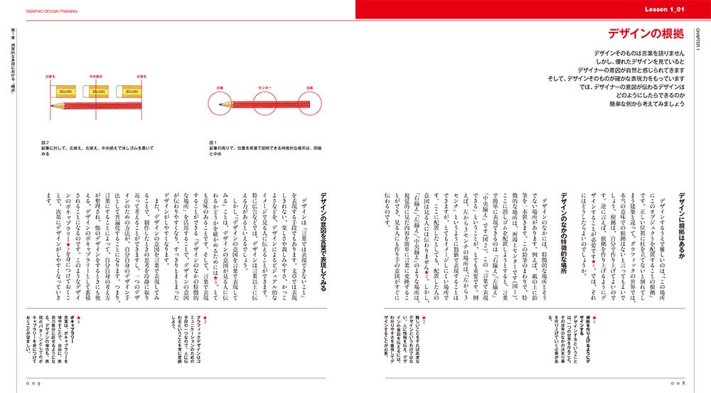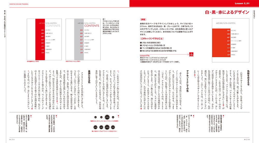 本書は基本的な図形や文字、色による平面構成から、実践的なレイアウトまでを、実際に手を動かして学ぶことのできる画期的なトレーニングブックです。