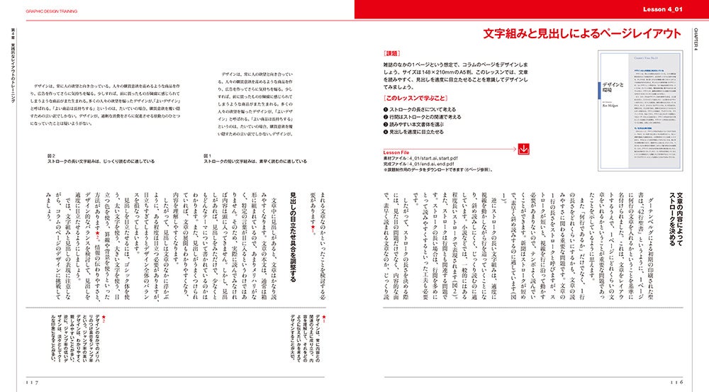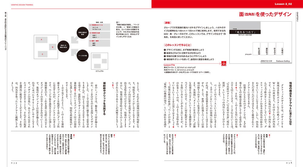第1章で視覚的な表現における「構成」をどのように組み立てるかの、概論を理解していただいたあと、第2章以降では平面構成やレイアウトのデザインスキルを段階を追って実習していく形式です。