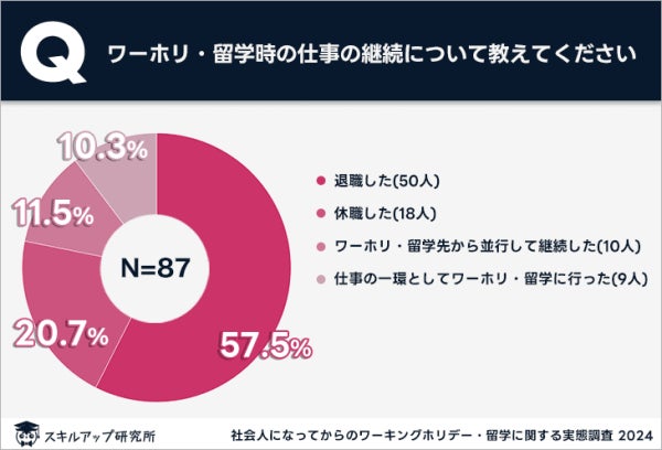 「ワーホリ・留学時の仕事の継続について教えてください」という質問に対し、57.5%が「退職した」、20.7%が「休職した」と回答した。社会人になってからのワーホリ・留学では、日本での仕事を退職または休職するケースが多いことが明らかになった。