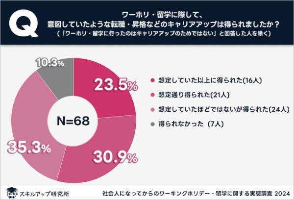 「ワーホリ・留学に際して、意図していたような転職・昇格などのキャリアアップは得られましたか?」という質問に対し、23.5%が「想定していた以上に得られた」、30.9%が「想定通り得られた」、35.3%が「想定していたほどではないが得られた」と回答し、合計で約90%がキャリアアップを実感していた。