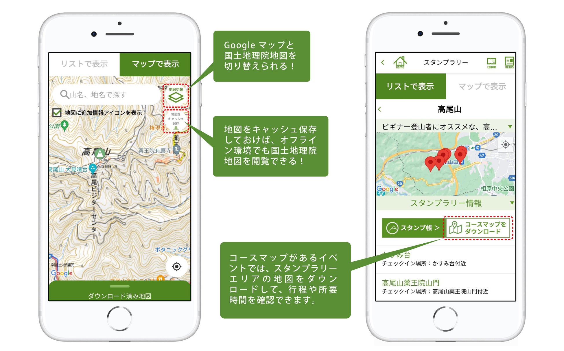 無料で使える便利で安心の地図機能として、現在地やチェックインポイント、現地情報などを、アプリ上の国土地理院地図、Googleマップ、コースマップで確認することができます。なお、国土地理院地図とコースマップは、事前にオンライン環境でデータを取得しておくことで、オフライン環境でも使用することができます。