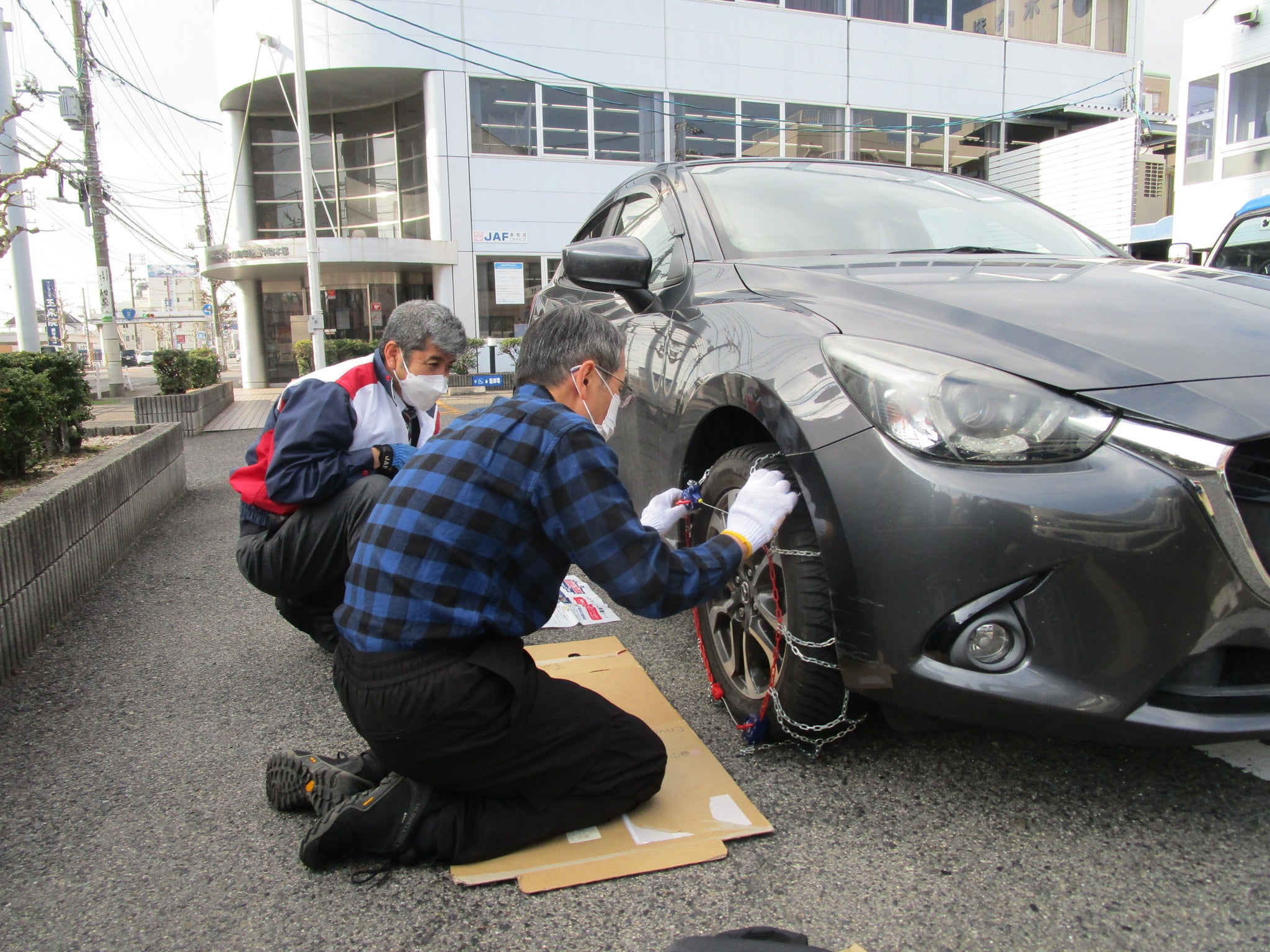 このような状況に備えて、JAF島根支部では新しくタイヤチェーンを購入された方や取り付けに不安のある方のために、取り付け方法をマンツーマンでアドバイスします。