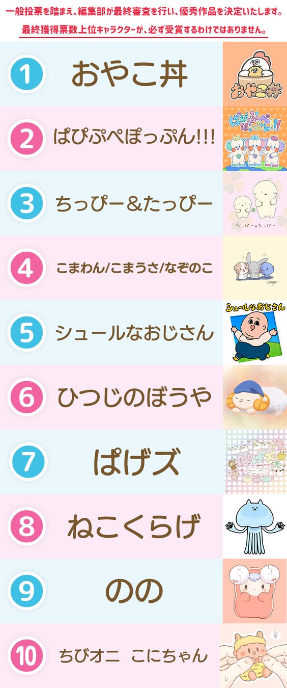 4位「こまわん/こまうさ/なぞのこ」、5位「シュールなおじさん」、6位「ひつじのぼうや」、7位「ぱげズ」、8位「ねこくらげ」、9位「のの」、10位「ちびオニ こにちゃん」。