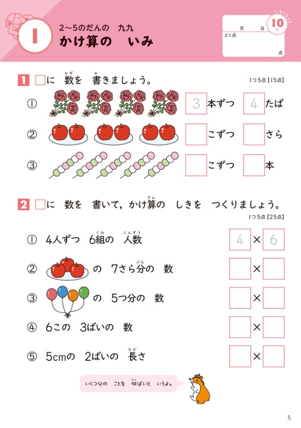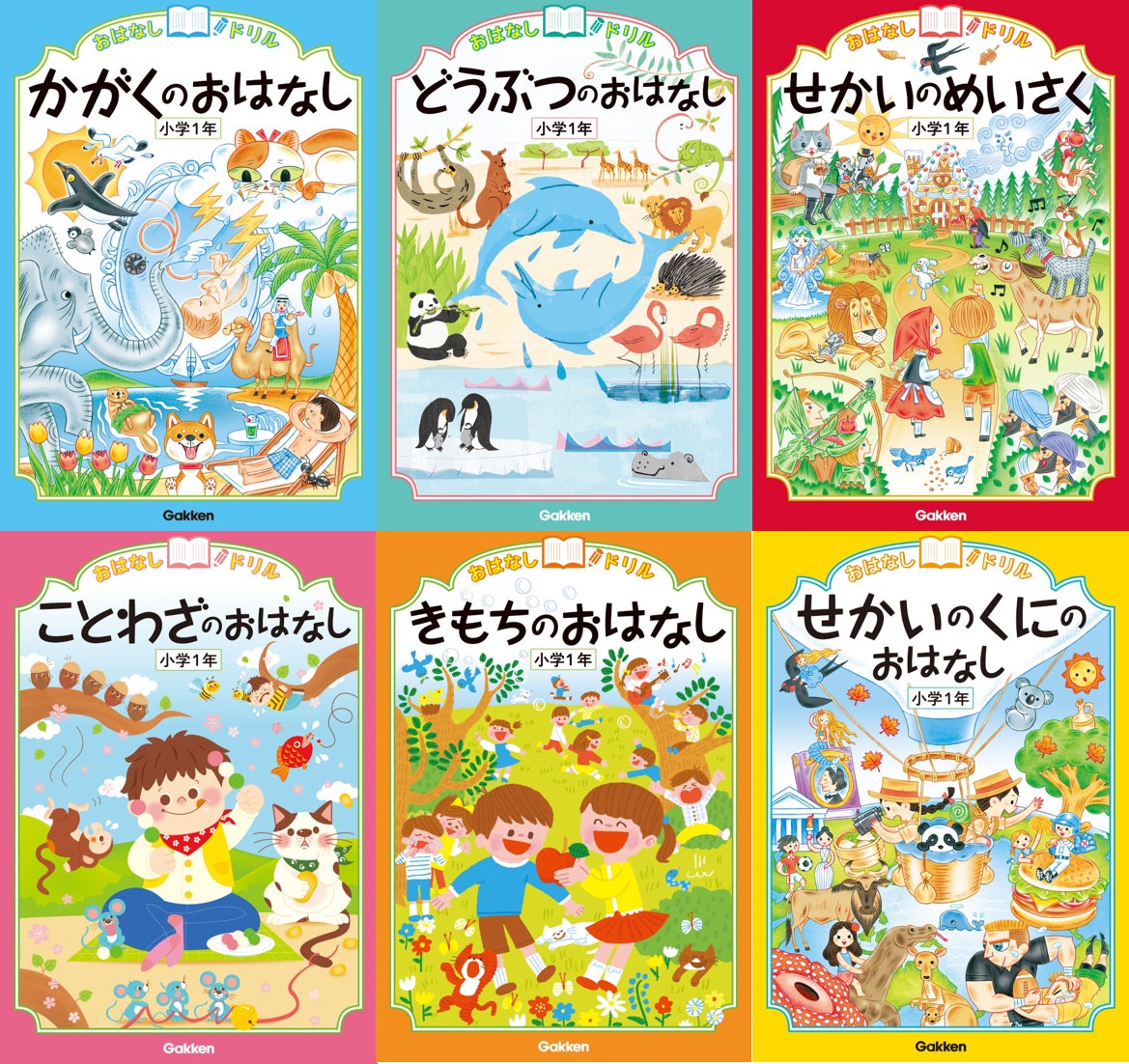 「お話」と「学習」が一冊になった新しいタイプの学習ドリルです。2ページで完結する短いお話を読んで、そのお話に関する問題を解いていきます。