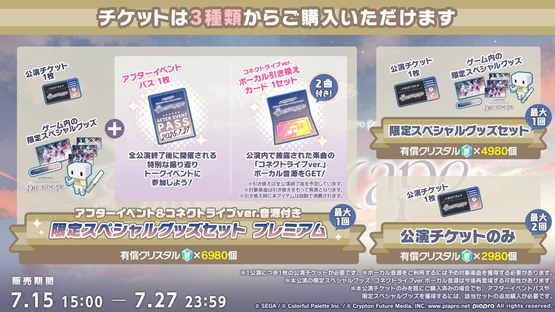ライブのチケットは、「公演チケットのみ」のプラン、パンプレットなどの限定スペシャルグッズがセットでついてくる「限定スペシャルグッズセット」のプラン、「限定スペシャルグッズセット」に加えて、全公演終演後の振り返りトークイベントに参加できる「アフターイベントパス」、「コネクトライブver. ボーカル引き替えカード」がついてくる「限定スペシャルグッズセット プレミアム」の3つのプランをご用意しています。