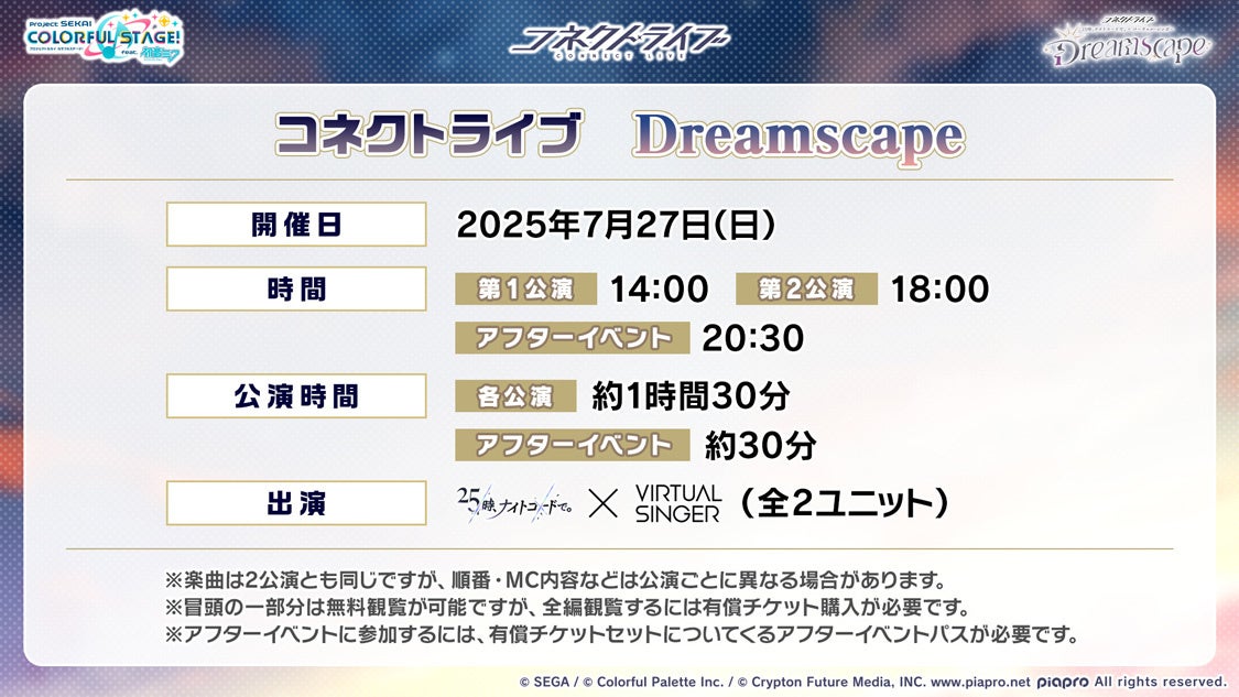 2つのユニットが共演する新しいコネクトライブの2組目となる、「25時、ナイトコードで。」×「バーチャル・シンガー」による「コネクトライブ Dreamscape」が、2025年7月27日(日)の14:00と18:00の2公演で開催することが決定いたしました。全公演終了後の20:30より、約30分間のアフターイベントも開催いたします。