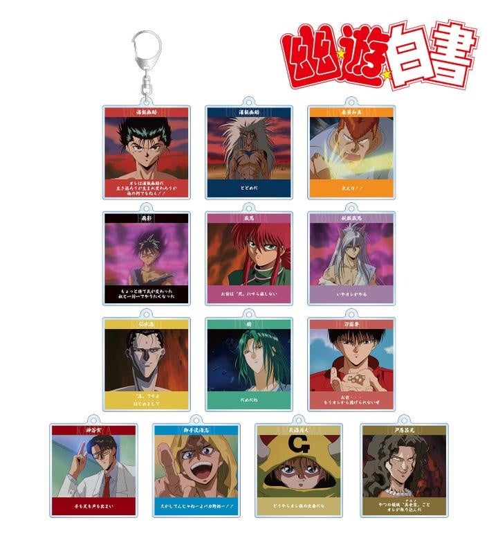 浦飯幽助、桑原和真、飛影、蔵馬、妖狐蔵馬、仙水忍、樹、刃霧要、神谷実、御手洗清志、天沼月人、戸愚呂(兄)の印象的なシーンと台詞をアクリルキーホルダーに仕上げました。