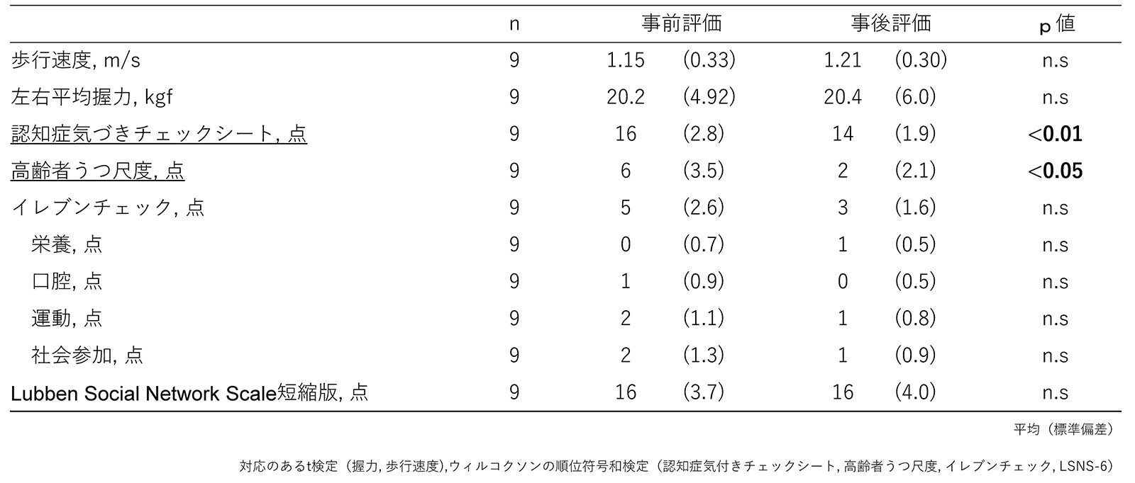 2025年11月末時点で、20名の介護予防期の高齢者およびその子世代にご協力をいただき、本研究開発の効果検証を実施しました。結果として、開始前と3か月間の介入を行った後の比較により、身体的リスク、精神心理的リスク、社会的リスク、栄養および総合評価で改善傾向がみられました。特に、認知症気づきチェックシートおよび高齢者うつ尺度(GDS)では統計的に優位な改善傾向が示唆されました。