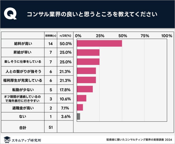 「コンサル業界の良いと思うところを教えてください(複数選択)」という質問では、半数が「給料が高い」と回答し、さらに25%の回答者が「昇給が早い」と回答した。
