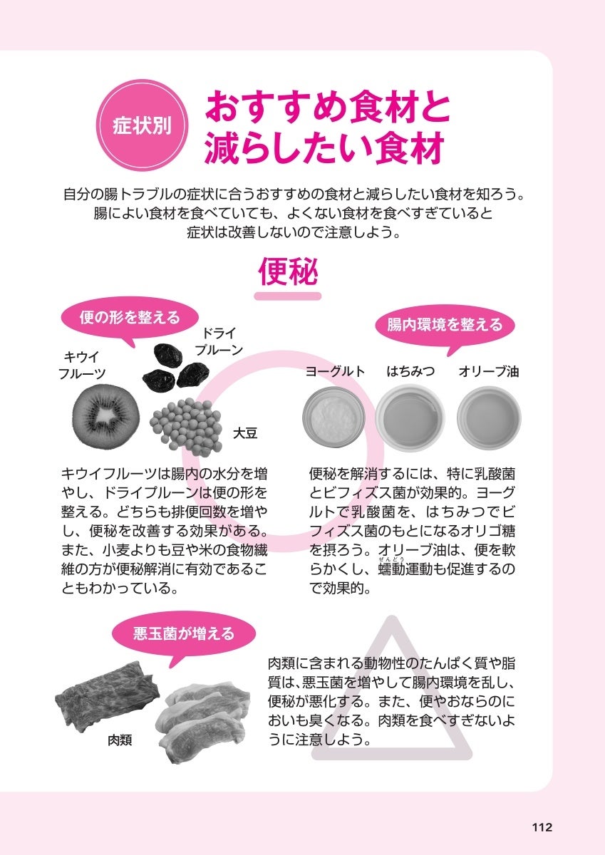 ……など、すぐに試せる知識やトレーニングをたっぷり掲載。さらに、巻頭には、「ドラッグストア(薬局)などで使える腸トラブル対策の市販薬やアイテムリスト」をまとめました。また、便の色が標準かどうかわかる【便の色チェックシート】や【排便日誌】も活用して、自分の便の状態を把握しましょう。