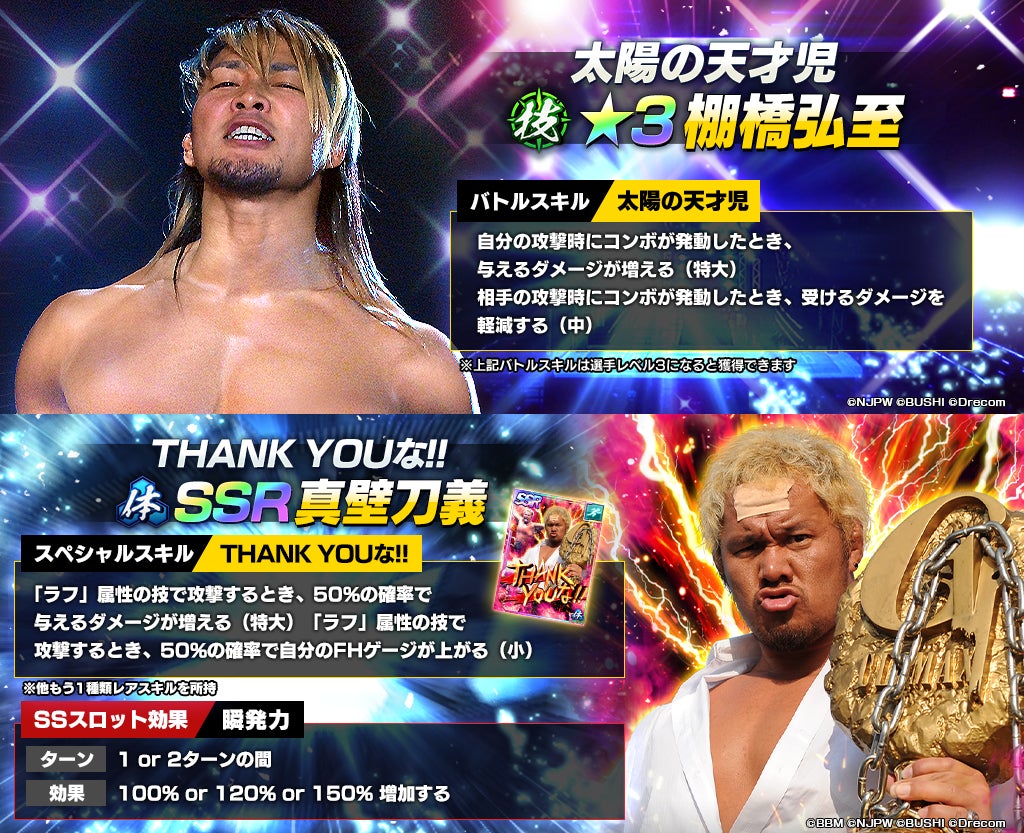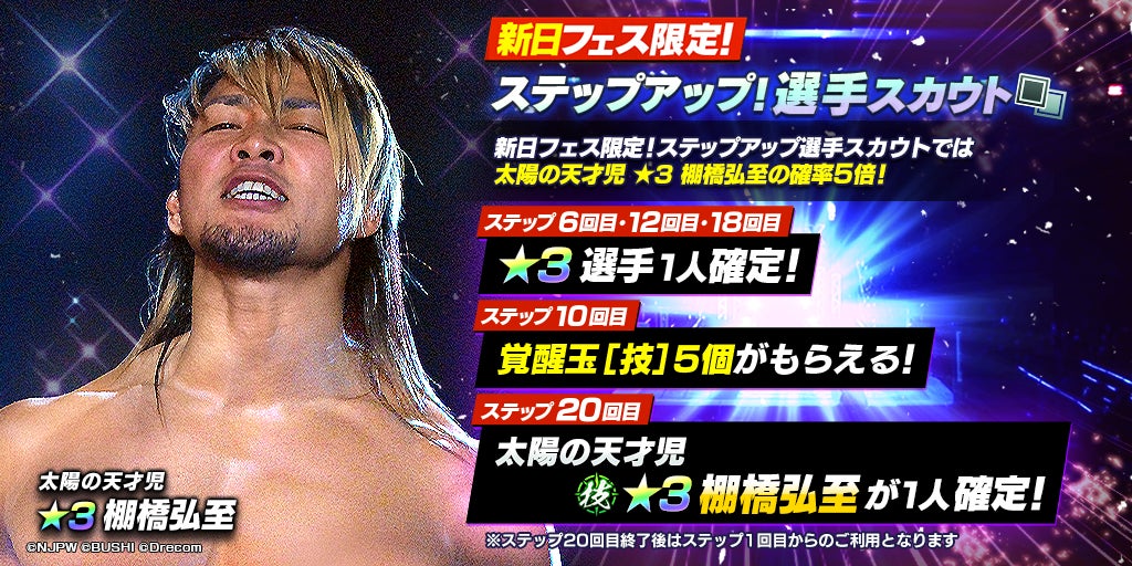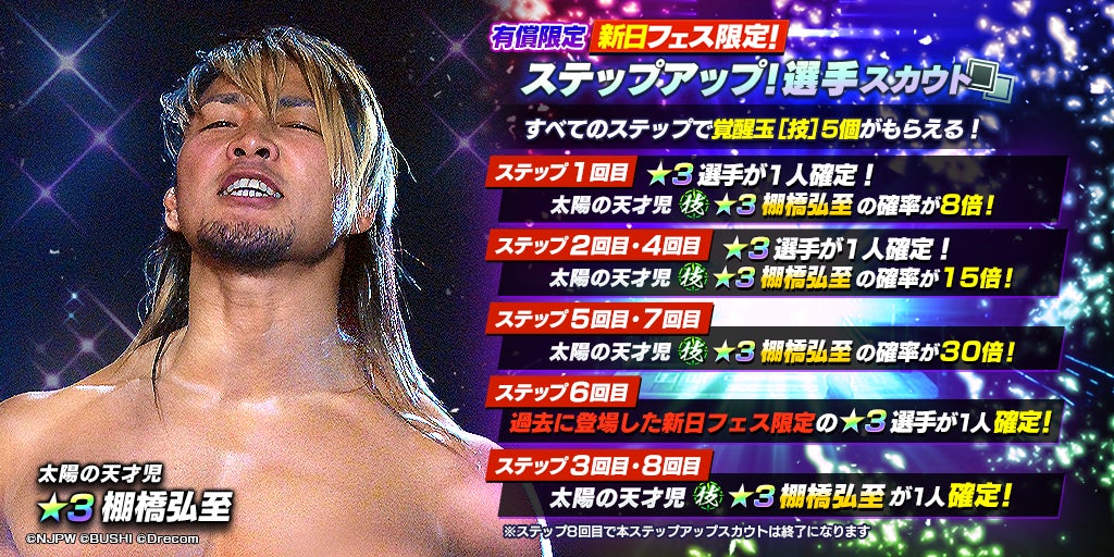 また、今回初登場する★3選手「[太陽の天才児]棚橋弘至」は、ピックアップ対象として、ステップアップ回数に関わらずスカウト確率が通常の5倍となっています。