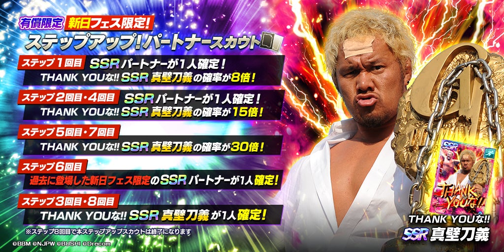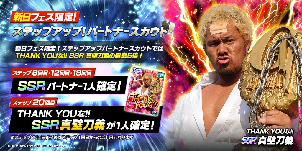 - 新日フェス限定!新SSRパートナーの真壁刀義選手が登場するステップアップスカウトを開催!