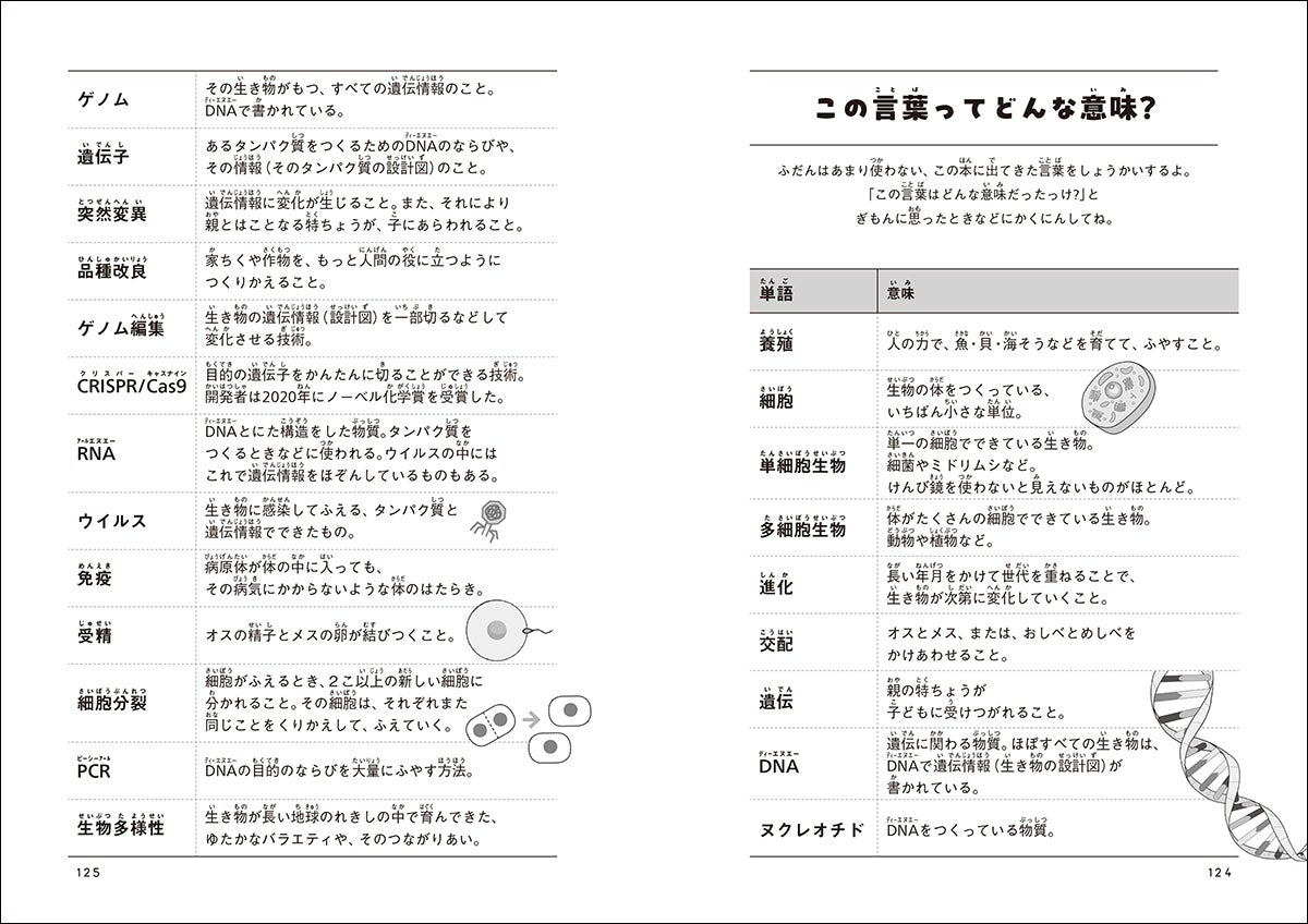 「遺伝」や「ゲノム編集」など、普段はあまりなじみのない、本書に出てきた言葉を紹介しています。むずかしい言葉が出てきても、すぐに調べられます。