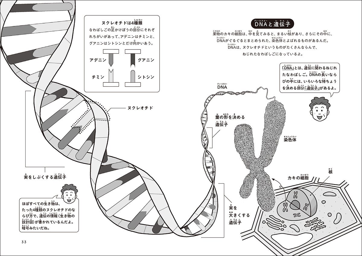 『22世紀からきたでっかいタイ ゲノム編集とこれからの食べ物の話』は、22世紀タイをつくった京都大学の研究者・木下政人先生との会話を通して、こうしたゲノム編集技術や、人の手によって開発されてきた食べ物の歴史を知り、未来を考えられる1冊。木下先生と小学生が会話をしながらお話が進む構成で読みやすく、図解も豊富に収録されています。はじめて「食」と「生き物のしくみ」を知るのにぴったりのノンフィクションです。