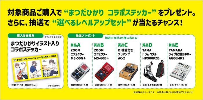 フェア開催店で対象商品を購入された方に「まつだひかりイラスト入りコラボステッカー」を贈呈。さらに 抽選で合計3名様に、「選べるレベルアップセット」をプレゼントします。入学、新学期、新生活の季節、リットーミュージックの入門書で憧れの楽器を始めてみよう!