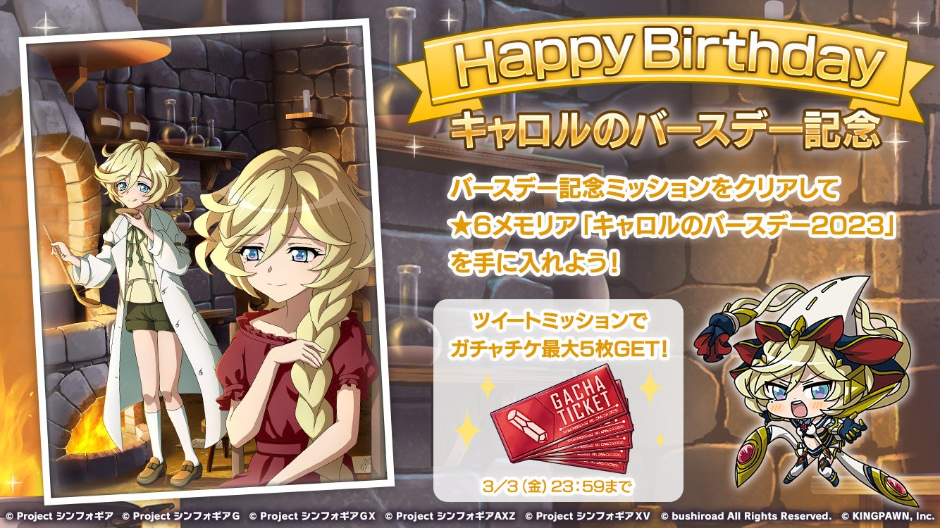 株式会社ブシロード(本社:東京都中野区、代表取締役社長:木谷高明)と株式会社キングポーン(本社:東京都中央区、代表取締役社長:清水祐一)は、好評配信中のスマートフォン向けゲームアプリ「戦姫絶唱シンフォギアXD UNLIMITED」にて、キャロル・マールス・ディーンハイムの誕生日を記念したキャンペーンを2023年3月3日(金)0:00より配信開始したことをお知らせします。