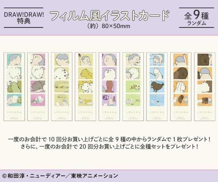 一度のお会計で10回分ご購入ごとに特典フィルム風イラストカード(全9種)の中からランダムで1枚、20回分ご購入ごとに全種セットをプレゼント!