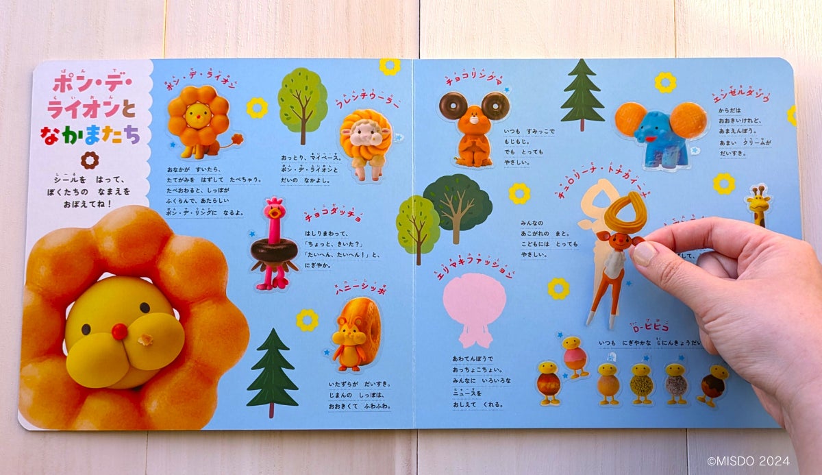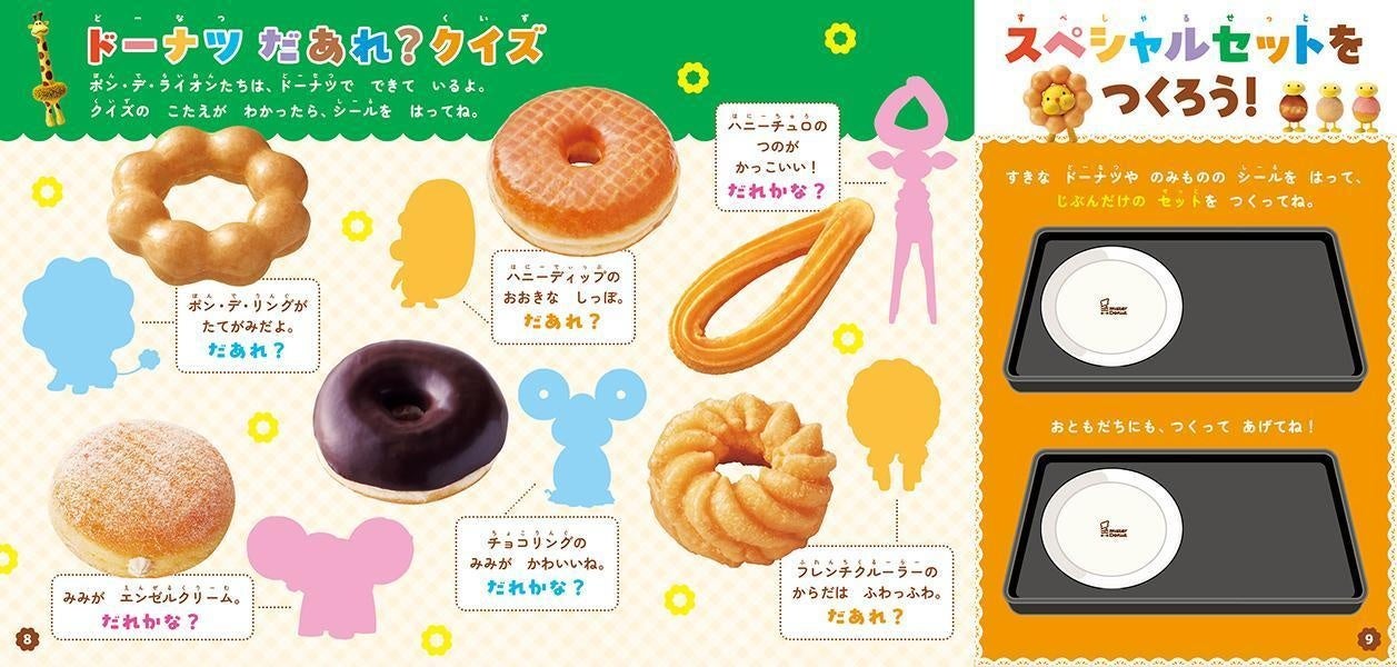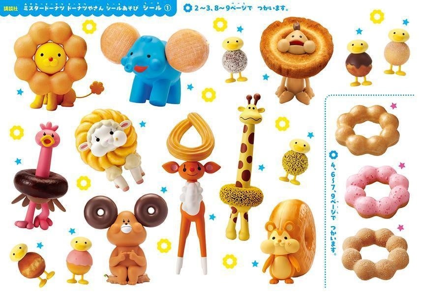 メニューの写真がそのままシールになった『ミスタードーナツ ドーナツやさん シールあそび』発売! 貼ってはがせるシールが63枚。ポン・デ・ライオンと仲間たちのシールもたっぷり!