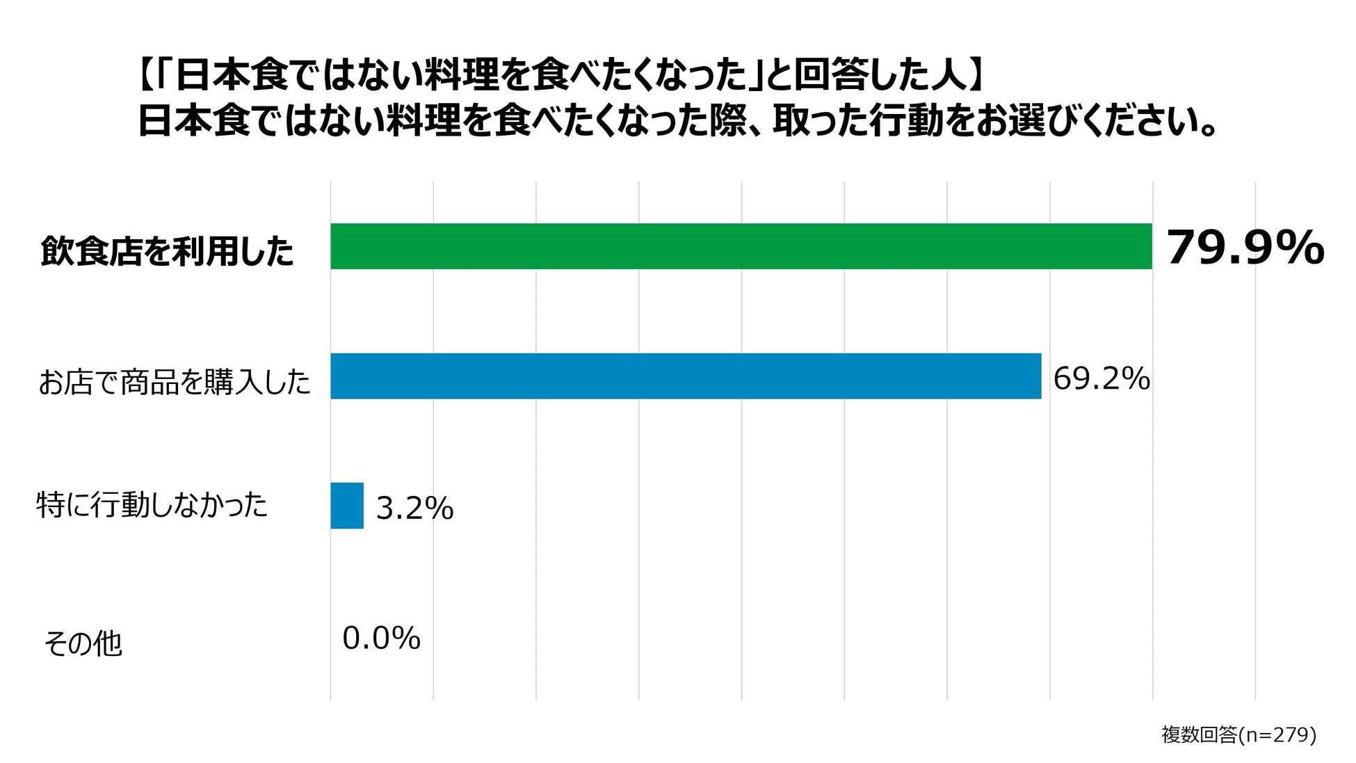 「日本食ではない料理を食べたくなった際、取った行動をお選びください。」という質問の結果、「飲食店を利用した」が79.9%、「お店で商品を購入した」が69.2%で、大きく差がない結果となりました。日本では、他のいくつかの国とは異なり、コンビニエンスストアで手軽にさまざまな国の料理を購入できる点も影響していそうです。