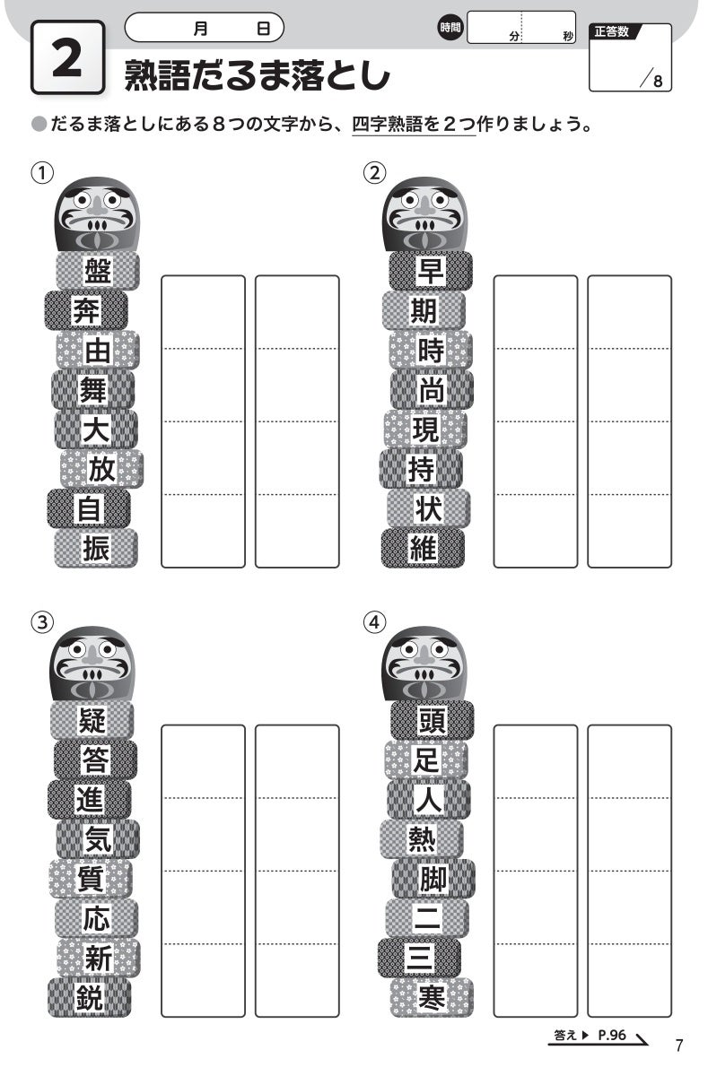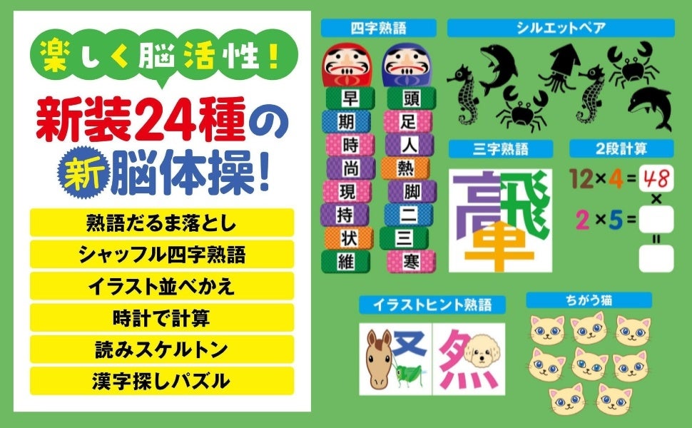 読み書き計算から、絵や文字や数字のパズルまで楽しい脳体操が満載。多彩な問題構成にしているので、楽しく遊びながら、自然とさまざまな種類の脳力をきたえることができます。熟語だるま落とし、ちら見! 三字熟語、イラスト並べ替えパズル、計算ぬりえなど、バラエティー豊かなパズルが満載!