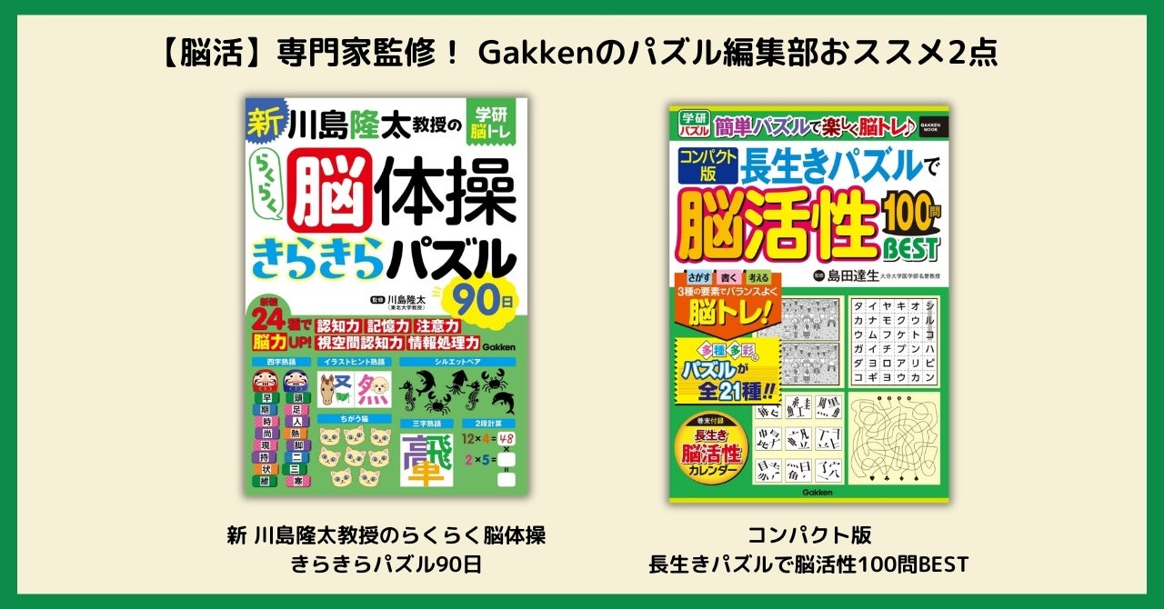 今回は、Gakkenの脳体操といえばこの方! 脳トレの第一人者【川島隆太教授】監修の脳トレ本、スキマ時間にさくっとできる、大分大学名誉教授・島田達生先生考案の【長生きパズル】、こちらの2冊をご紹介します。