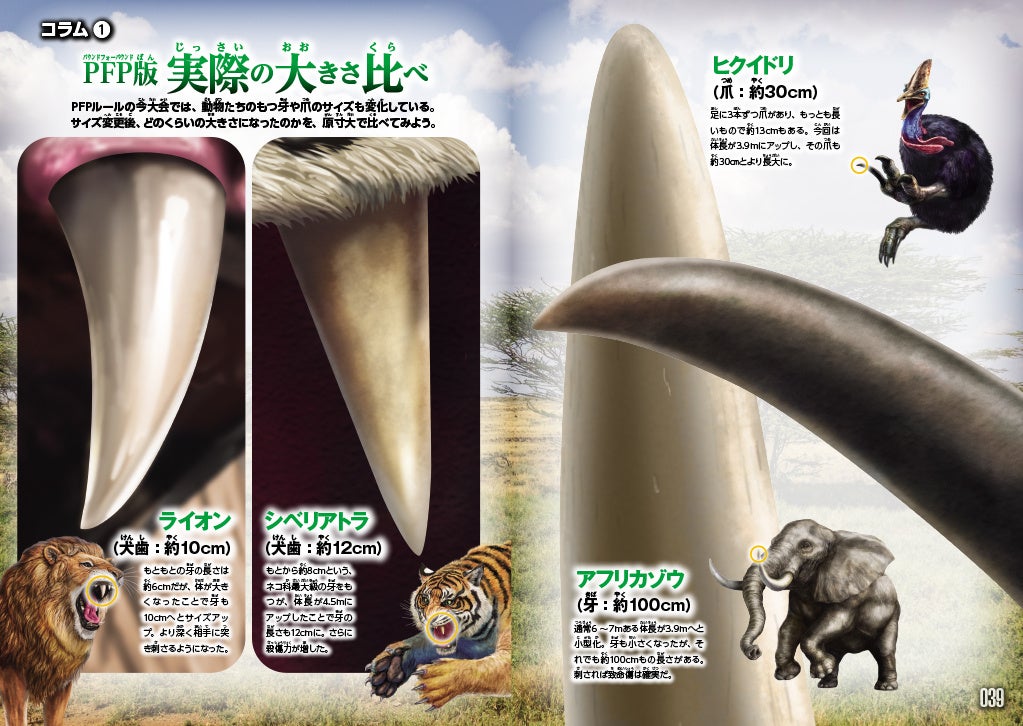 この変更により、動物たちのサイズはそれぞれ変化し、もともと1,000kgを超える体重を有した動物の体は小さくなり、逆に1,000kg未満の動物は大きくなっている。また、筋力がアップする分、敏捷性が下がるなど、運動能力についても多少の調整がかかっている。これらを頭に入れてバトルの展開を予想してみよう!