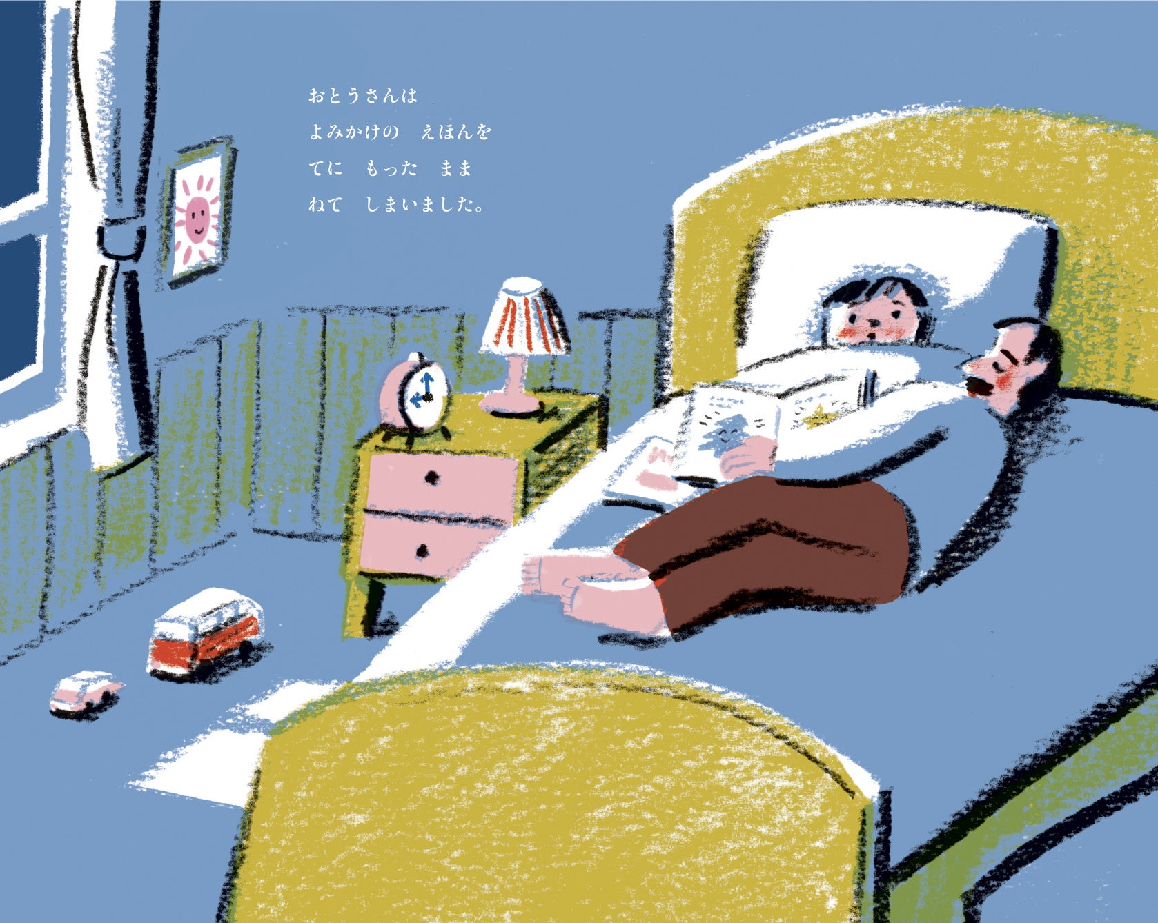 夜眠れないとき、身体を横にしたり、仰向けになったり、いろんな向きに動かすことはないでしょうか。この絵本は眠れない“ぼく”に起こった、どこまでもへんてこで、でも「なんだかわかるかも」と思えてしまう、愉快で親しみのわく体験を、どこまでもユーモラスに描いています。ぼくのもとに現れる不思議な△△は、一度読んだらきっと忘れられない衝撃をもたらすことでしょう。夢にも出てくるかもしれません。おやすみ前に読み聞かせるのにぴったりな、わくわくどきどき幸福なベッドタイムストーリー。