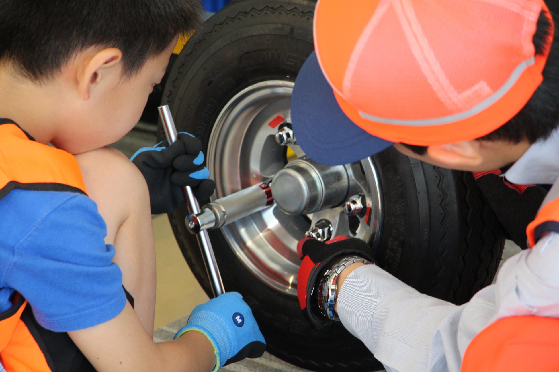 屋内ブースでは、本物の免許証そっくりの「子ども安全免許証」の発行や「バッテリー上がりの作業」、本物の工具を使った「タイヤ交換」など、ロードサービス隊員になりきって体験ができます。