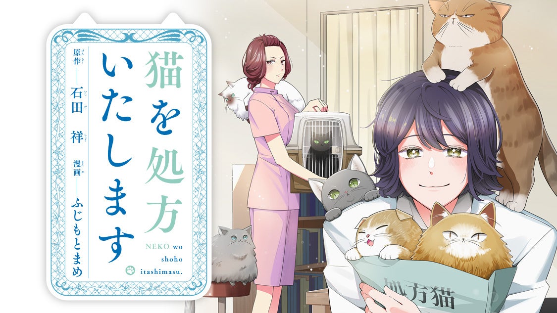 原作小説シリーズ『猫を処方いたします。』(作:石田祥 / 刊:PHP文芸文庫)は累計24万部突破。猫好きさんはもちろん、少しお疲れ気味の現代人に大反響の本作が、『イケメン女子と金髪ショタ』(コミックDAYS)などで人気のふじもとまめによるコミカライズで、本日9月27日より月刊少年マガジン編集部がおくるWeb漫画サイト「月マガ基地」にて連載開始となりました!