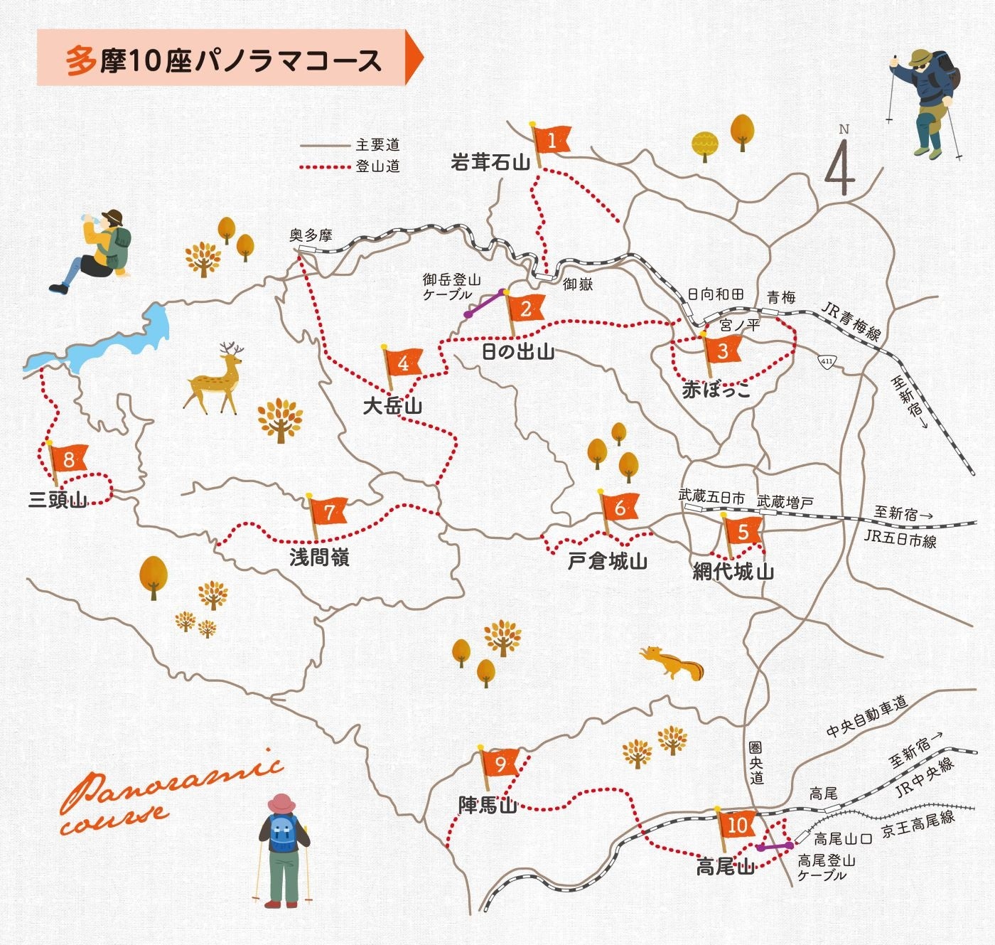 そんな多摩エリアを巡る「東京多摩ハイク スタンプラリー」のコースは、山頂からの景色が美しい10の低山を巡る「多摩10座パノラマコース」と、奥多摩きっての渓谷美が堪能できる「大多摩ウォーキングトレイルコース」の2種類です。どちらのコースも、新緑や季節の花々など、訪れる度に異なる美しさがあります。ぜひ季節を変えて何度でもお楽しみください。
