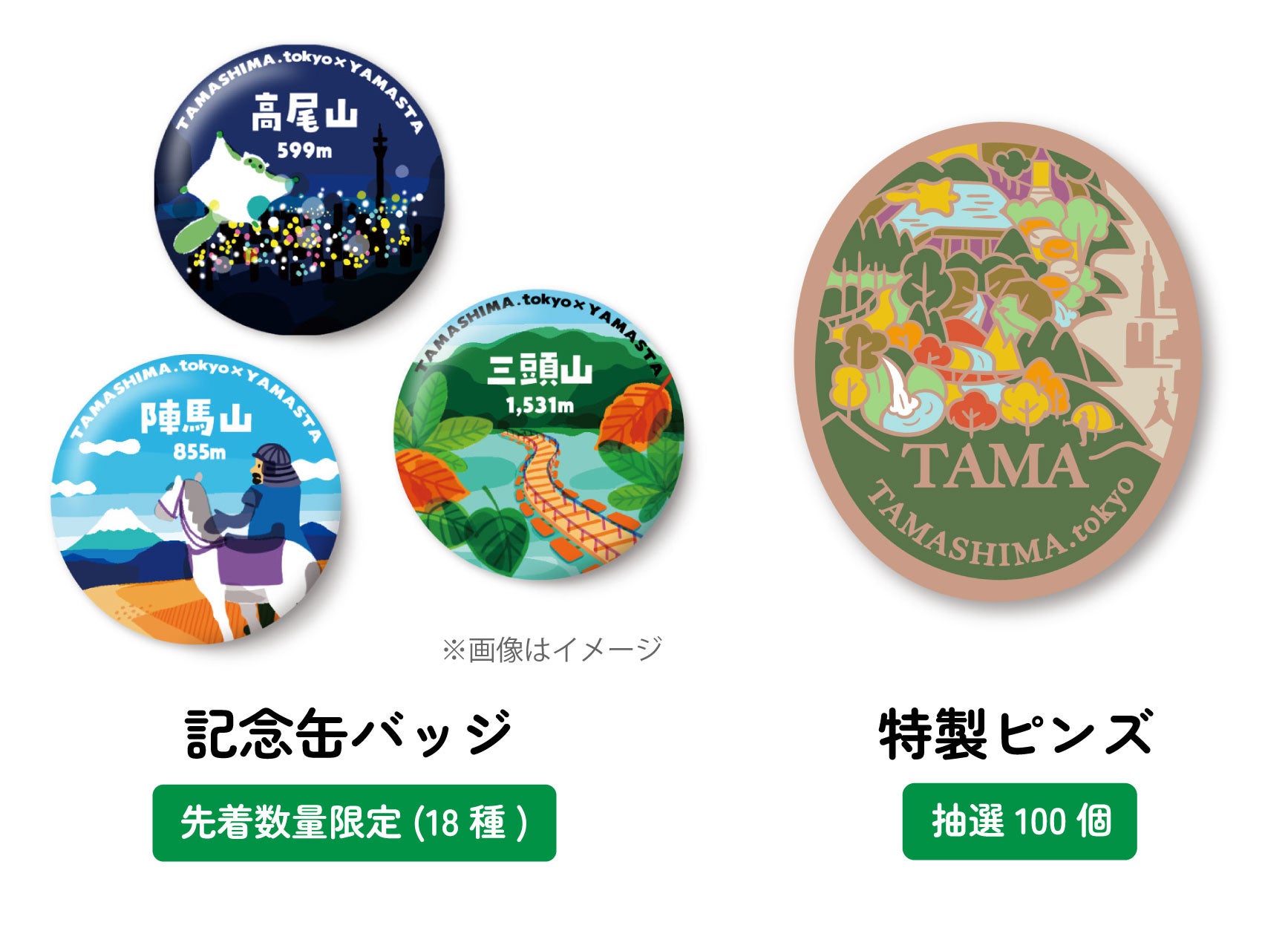 スタンプを獲得またはスタンプラリーを達成すると、記念缶バッジがもらえるほか、山のお土産ブランド「Yamasanka(ヤマサンカ)」とコラボした特製ピンズの抽選に応募することができます。
