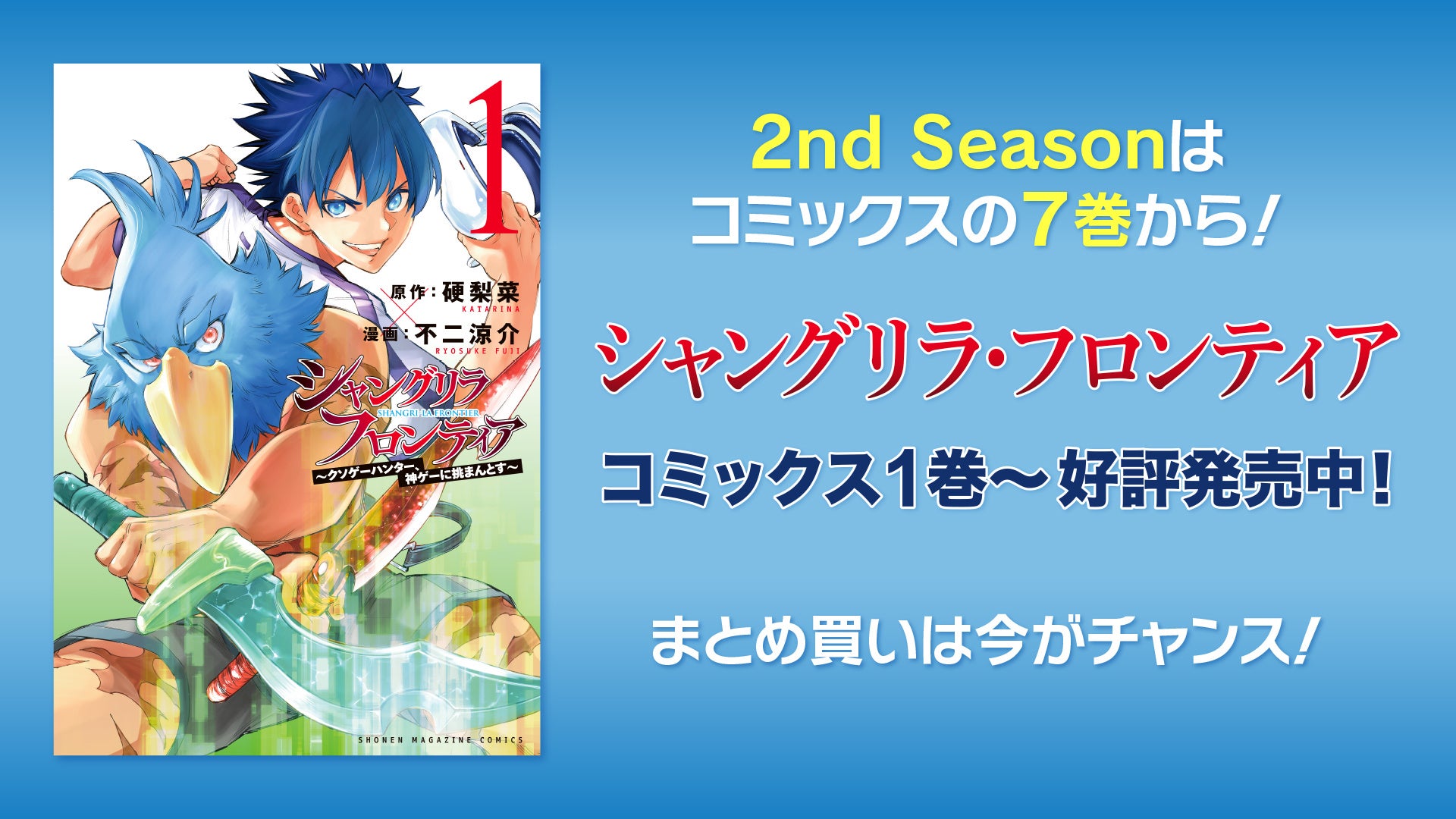 TVアニメ『シャングリラ・フロンティア』の2nd Seasonが、2024年10月13日から再び「日5枠」にて連続2クール放送開始!2nd Season放送直前を記念して、講談社が運営するYouTubeチャンネル『フル☆アニメTV』にて、TVアニメ『シャングリラ・フロンティア』1st Season全25話を期間限定で一挙無料配信いたします。本日10月6日から10月20日までの期間限定配信となりますので、ぜひお楽しみください!