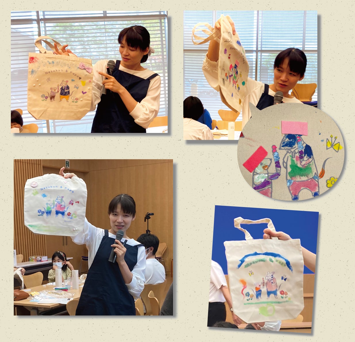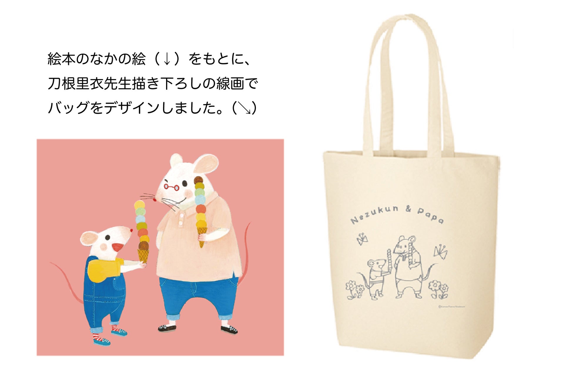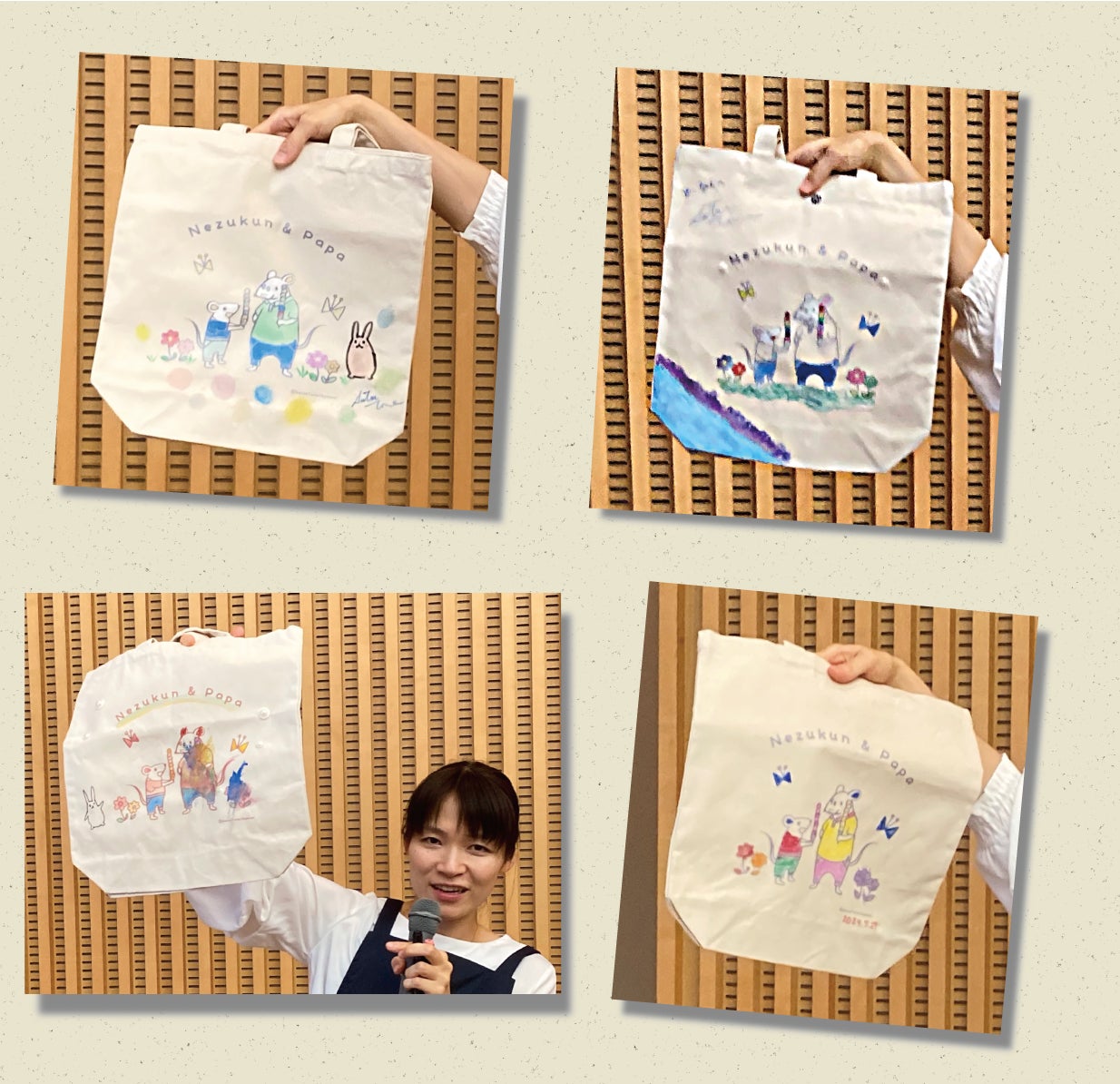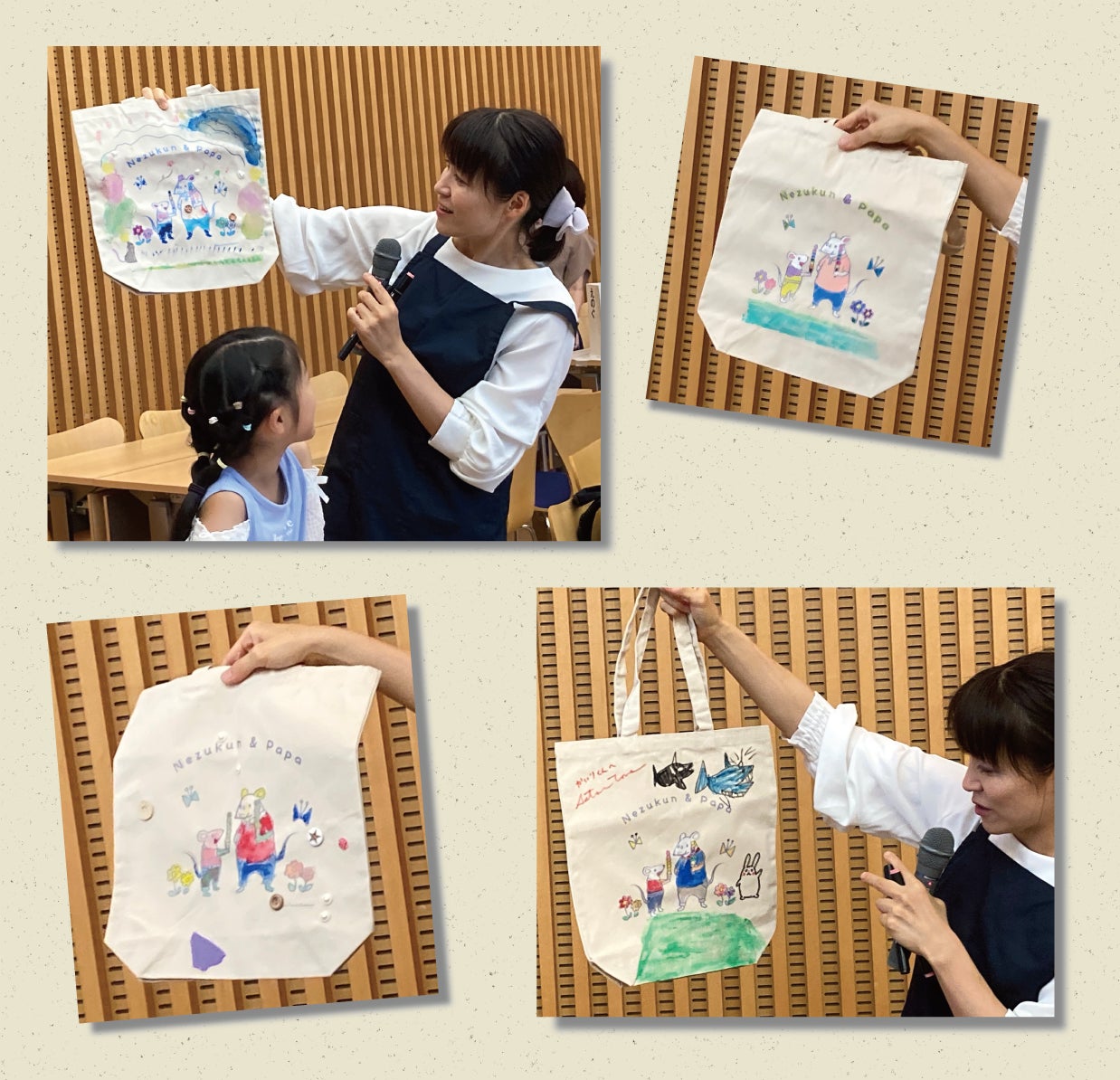 絵本の世界に浸ったあとは、お待ちかねのオリジナルトートバッグ作りです。最新作『ねずくんとパパのおるすばん』(Gakken刊)のページの中から、「7段重ねアイスクリームを楽しむパパとねずくん」の仲良しツーショットを、特別に線画で描き下ろしていただき、作成したオリジナルトートバッグです。